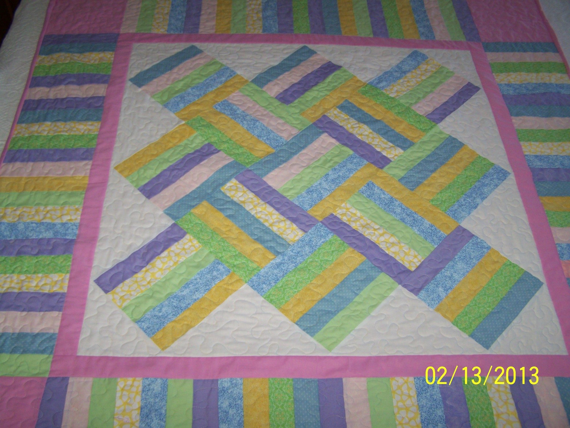 I free motion the stippling and use a darning foot. A friend that is a Master Quilter gave me information that I'll pass along. Usually when you do "free motion quilting" you lower the feed dog, but it isn't necessary as there is plenty of room and it helps control the bobbin thread. The pieces are 2x8 that form the "split rail fence" pattern and the finished blocks were 8x8.Wow how beautiful, and for the stippling how did you transfer the pattern? Oh and you need a walking foot correct? I am now inspired to do another baby quilt, how big were your blocks? I wish I lived close to a quilter. I need to find a group, they gotta be out there especially since this is not that big of a town.