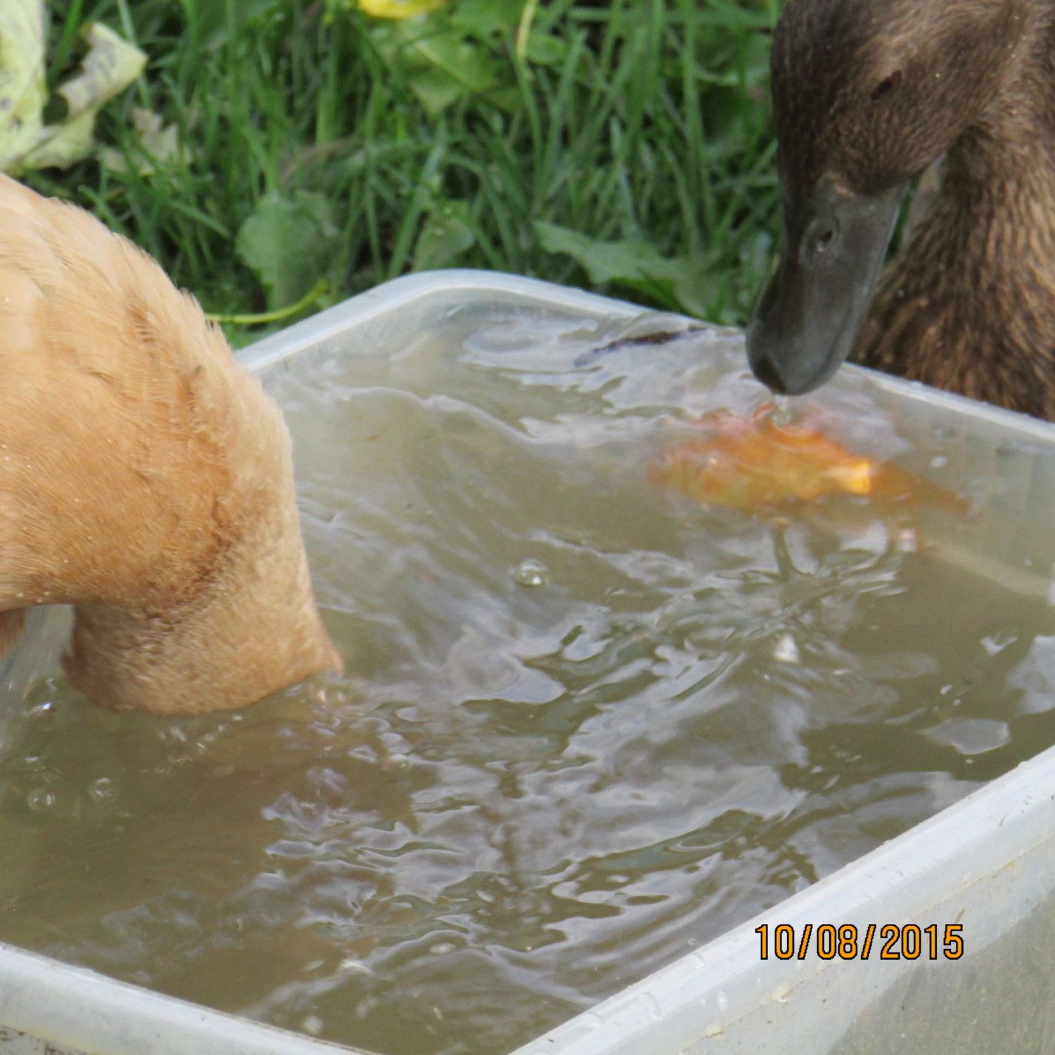 So I've been reading up on ducks and I thought I'd give my ducks a treat. Went to the pet store and bought some feeder goldfish/minnows. Came home and put them in the rubbermaid container that they like to bathe/drink in. So I'm watching the girls and waiting and FINALLY one of them goes to the container. As she's sticking her head in to take a drink, she see's the fish and she JUMPS to the side and squawks! She had this look like, "What the HECK is THAT!!!" And now neither one will go towards the container! (and the fish are barely half an inch! lol) Well, looks like we have some new pets!