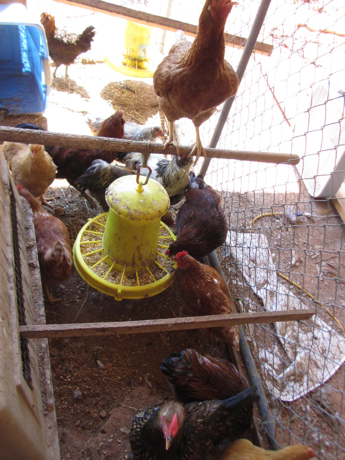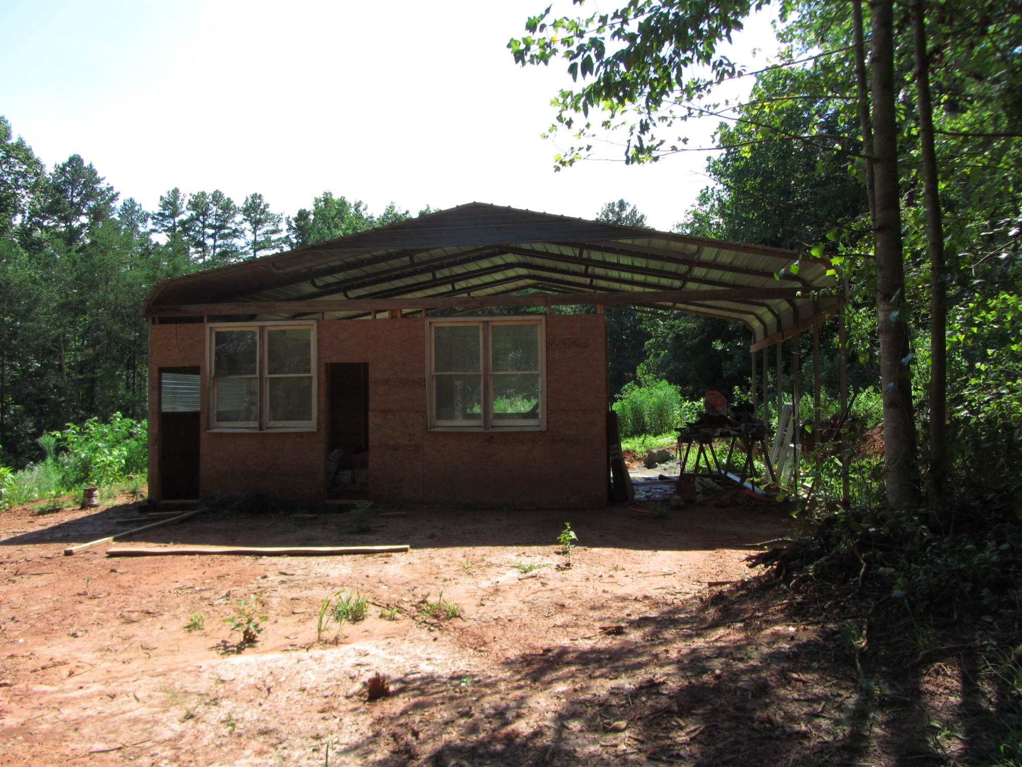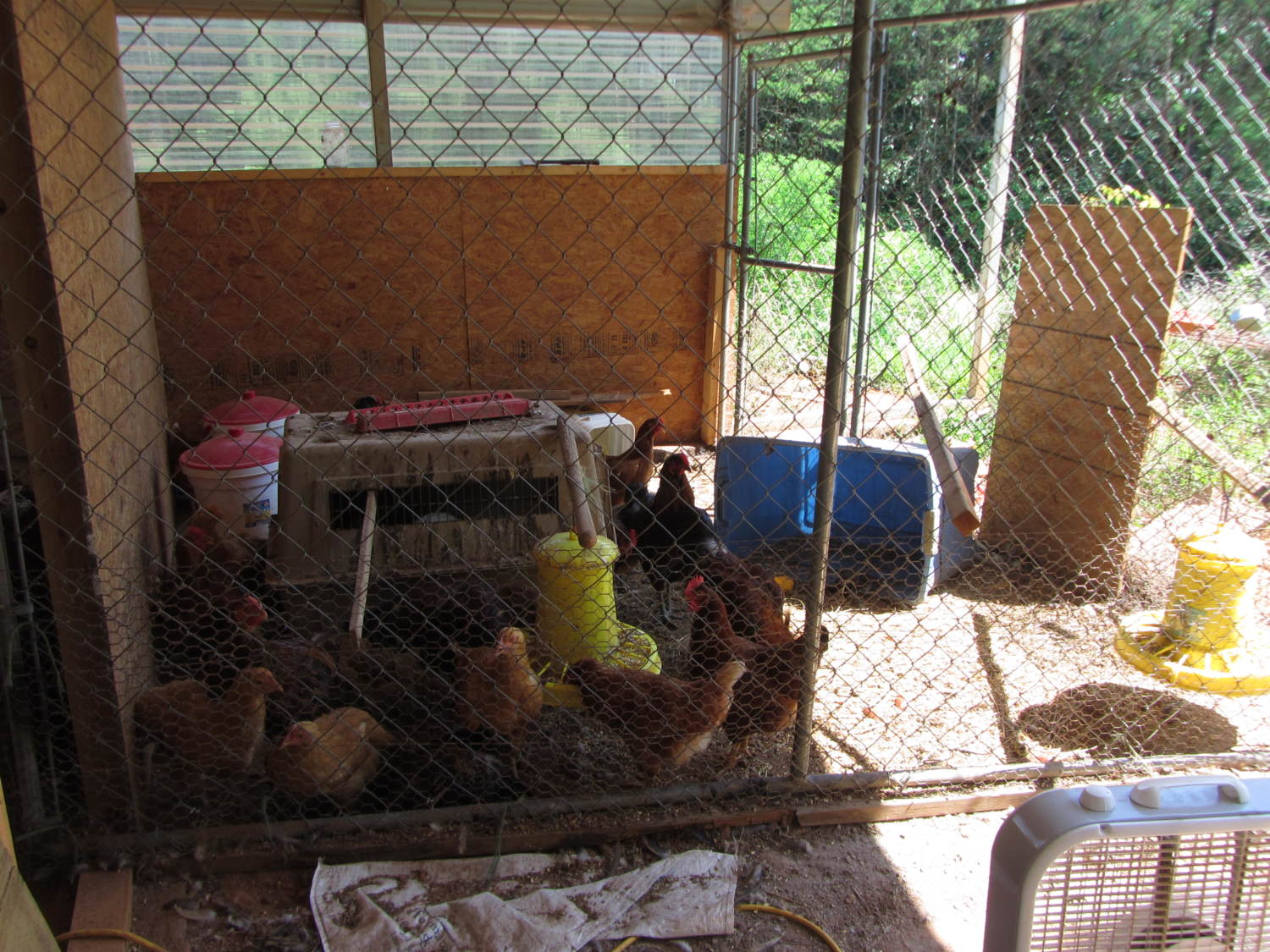 Maybe some of my pics will come through this time:::: This is the new milking/kidding barn we are building, the chicken coop will be added to the left side of the picture, going out about 20 feet & be the length of the building, 25 feet. this is the quick coop made with the panels from the dog kennel,(needed to put up the fan in the lower right of the pic, it's been so dang hot!) working well for now. These are great feeders from PrimierOne.com, the price for them and the waterers were half the price then those at the local feed stores (TSC & Southern States).
