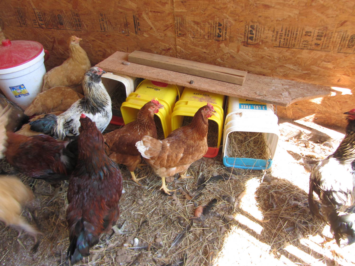 And these are the cat-litter box turned egg nest where they are giving me 4-5 eggs a day now!! (That's a 5 gal. insulated waterer in the left corner, FANTASTIC item, easy to clean, fill and carry. Its sitting up on some blocks to keep out litter.)