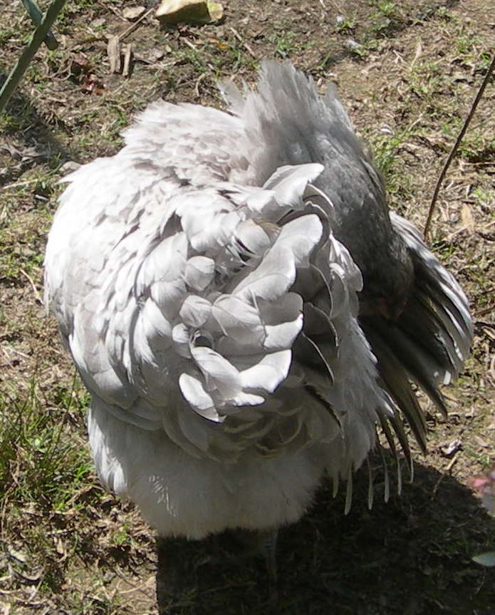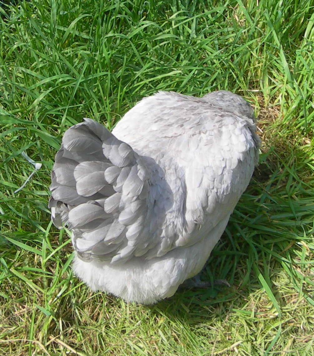 This was my EE/ Wheaten look alike.... see the white in her tail? that should be Black or Blue in a wheaten ( a splash wheaten might look like my EE). See how dark her color is.... wheatens are like that more of a buff color all over. Even if my pullet was a pure Wheaten (and she may very well have been she had wheatens too) the fact that she lacked a beard made her an EE as she didn't meet the standard for Wheaten Ams.
