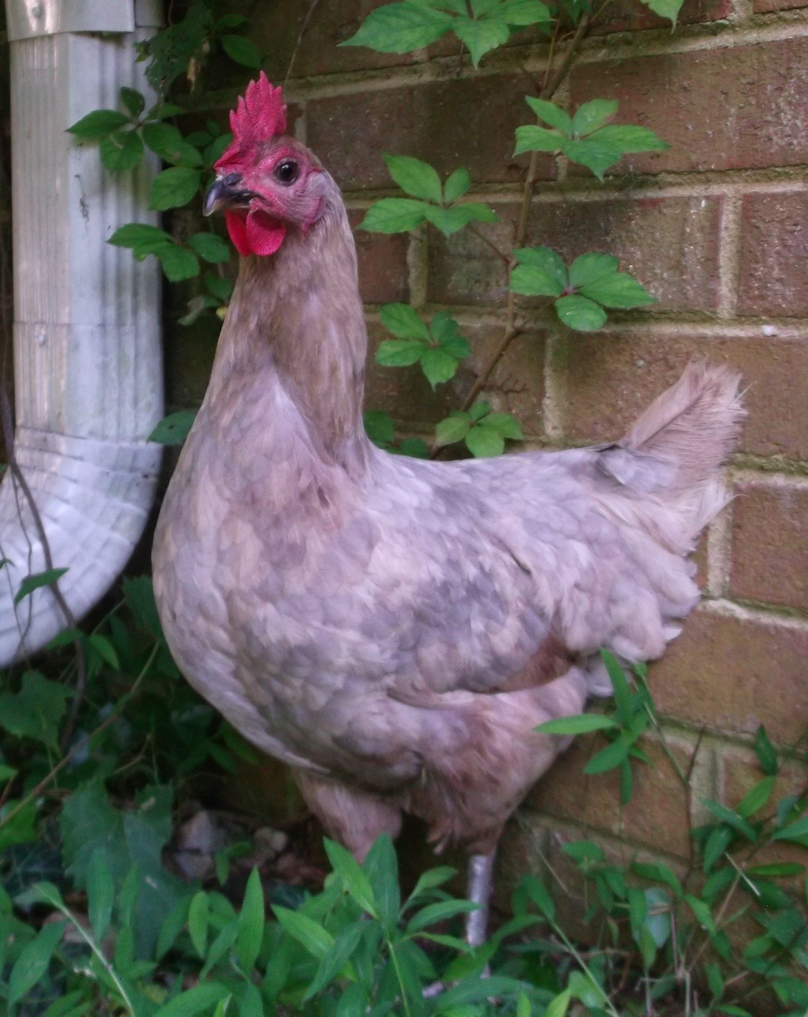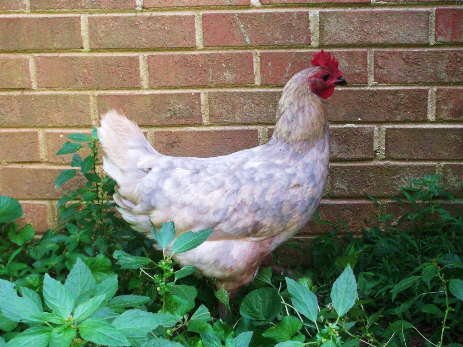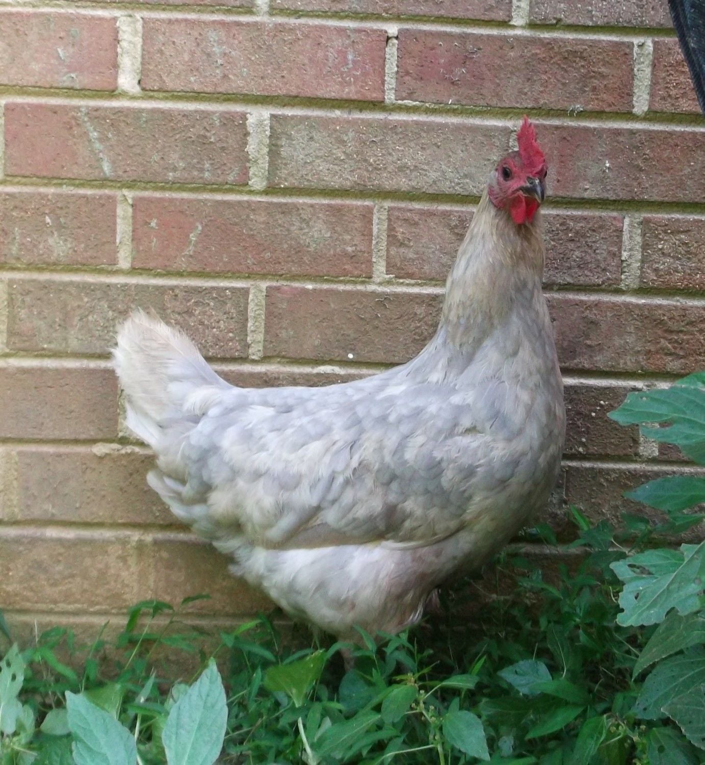 The pics do not do her justice. She is beautiful lavender and buff, the lavender being very blue in the day light. She looks mottled/spotted, she's a year old, 5 toes, white ears, grey blue feet. Hasn't laid an egg yet, we just got her 3 days ago.