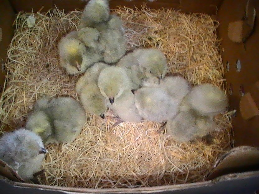 Chicks ! Here is the interesting thing these are sex link Ameraucana . Sadly only 2 pullets out of 8 chicks . Males have the white head spot . Cuckoo hens split for lavender covered by a lavender rooster .