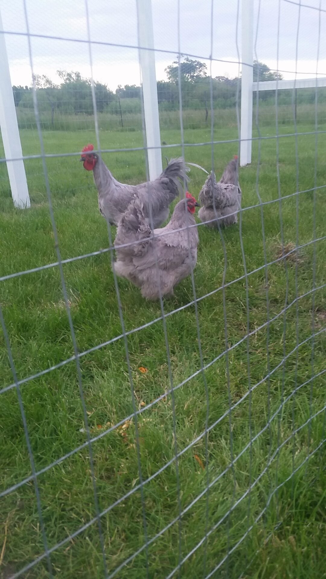 is it possible that they're english/american orpington mixes?I was hoping someone here could tell me a little bit more information on some things. I am new to Lavender Orpingtons although not really that new to chickens. I had a mixed flock before of good egg layers but when I got my new coop and run, I decided to settle on one breed and hatch some eggs and raise some chicks to sell. I wanted something that wasn't just a pretty face, but could hold it's own in the egg laying department and was kid-friendly as well so I went with the Lavender Orpington. I have a dozen eggs in the bator right now that I picked up from a local lady but when I went to pay for them, she told me to just take them because some of hers were hatching and they looked buff. Well I've done a bit of reading and have seen that a Lav bred to a Lav should produce 100% Lavs. I think they were only day olds or so, so maybe they just appeared buff to her? But all the pics I've seen have clearly looked lavender. So question #1 is: Do your chicks appear to be buff when hatched sometimes? I also picked up a trio at a small animal auction a couple weeks ago. One of the hens appear to be older but she's still laying daily. When comparing them to the first pics in the thread, I noticed a few things, a few differences. I'm new to breed standards for chickens and I know that Lav. Orps. aren't an APA recognized breed yet but certainly there are some breed standards to strive towards. One thing I noticed was that a lot of birds pictured have black/dark eyes. Mine have a light brown. Is one preferred over the other? Also, my birds have deep, bright red combs and I've seen others with much paler combs. Just differences or is one preferred over the other? So question #2 is: What breed standards do you find most important for LO's? I've included a pic of my birds for a little more information! Thanks guys!![]()