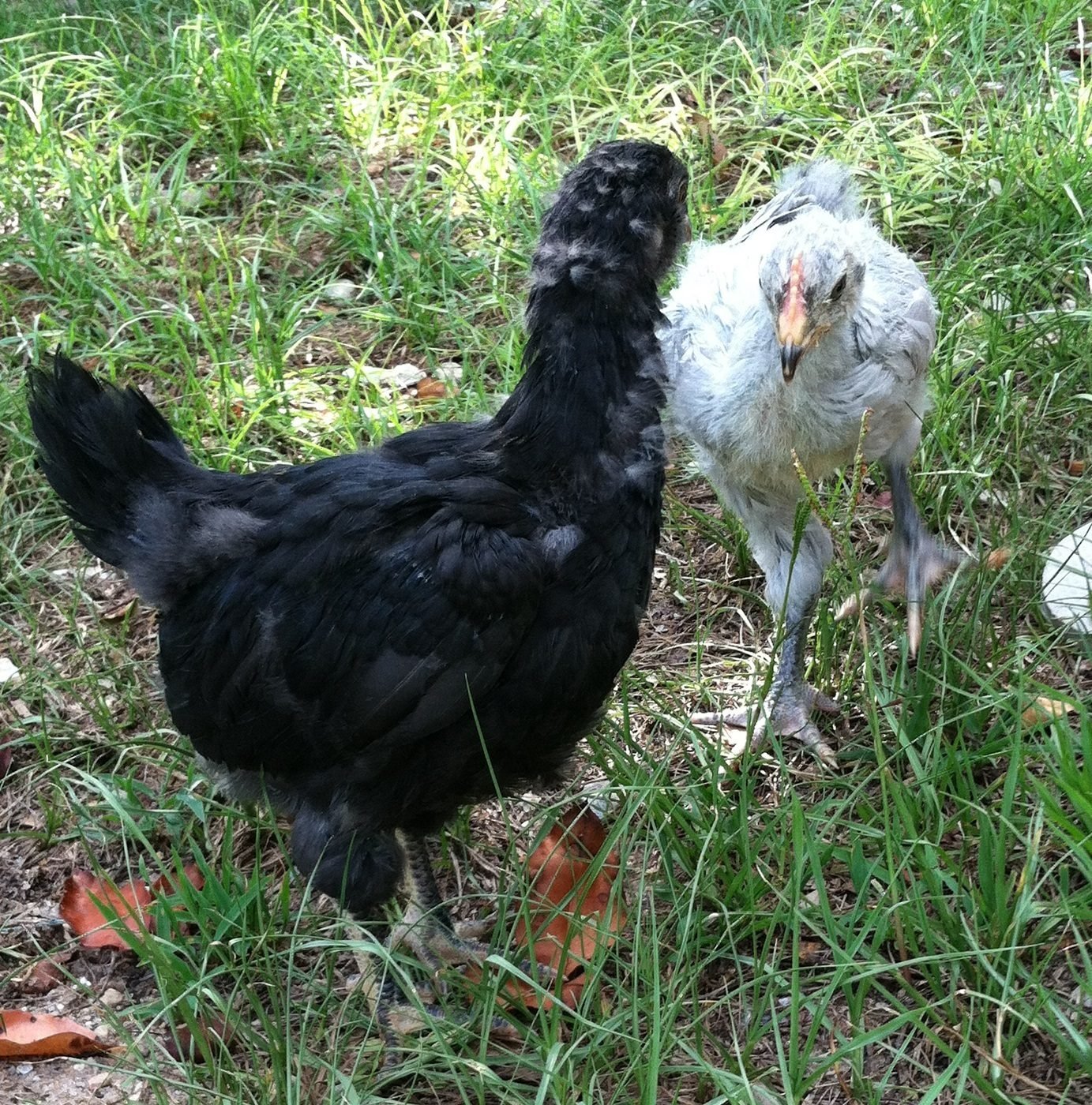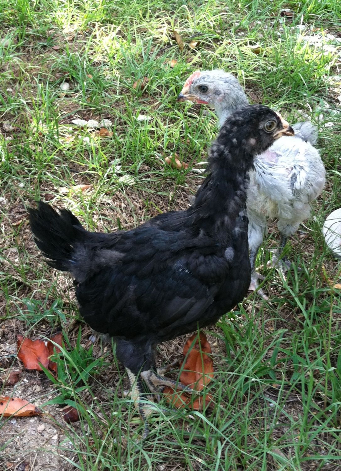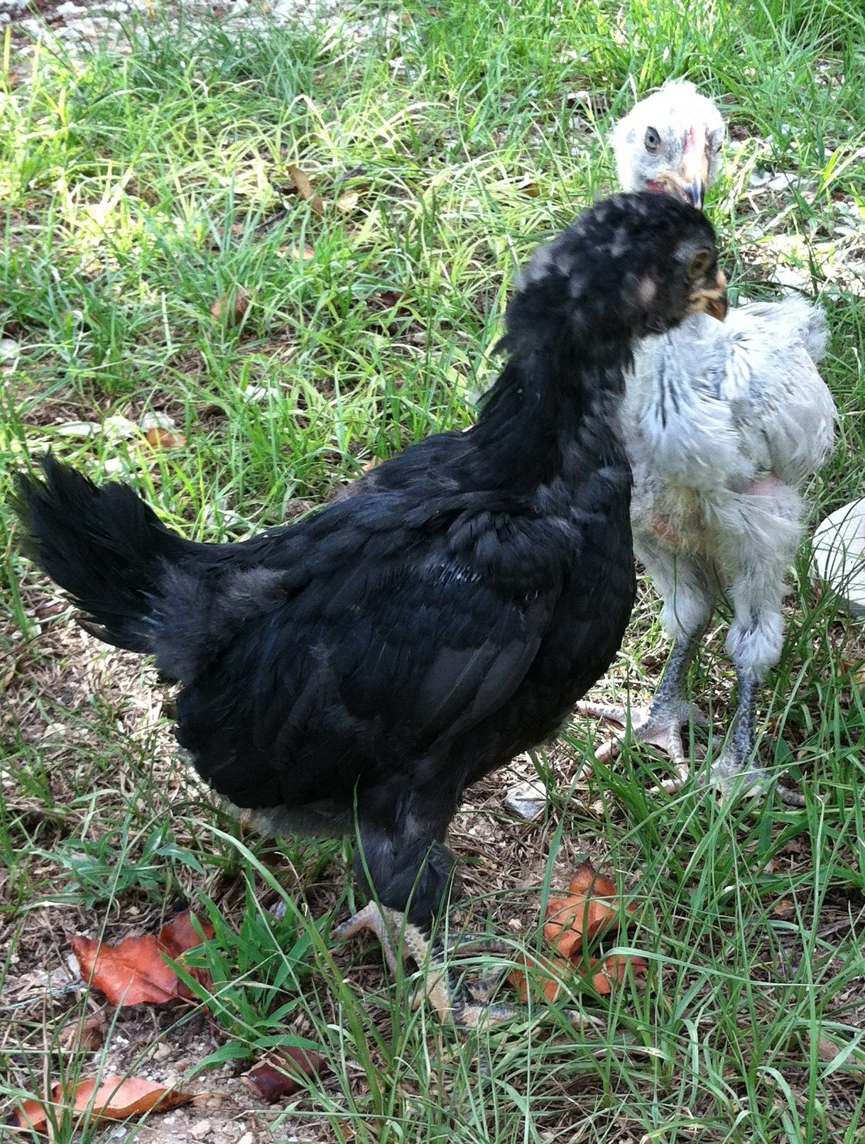They are now about 6 weeks old. They surpassed her in size about a week ago, but she still leads them around & tries to cover them at night. For a breed that "seldom goes broody" she has some strong maternal instincts.