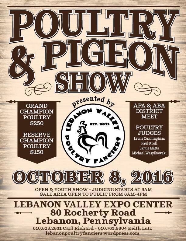 Oct 1, 2016 #1 AppleJackAcres Chirping 6 Years Joined Feb 7, 2013 Messages 166 Reaction score 17 Points 96 Location York County, PA Large show in Lebanon, Pa. Oct 8. Large sale area. Over 1000 birds entered at show.