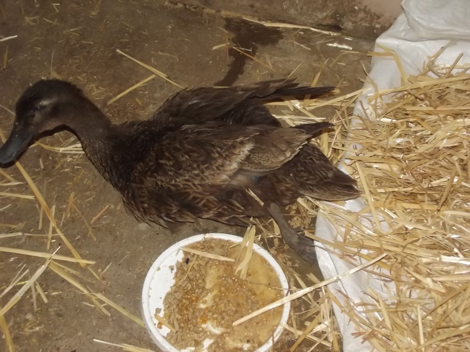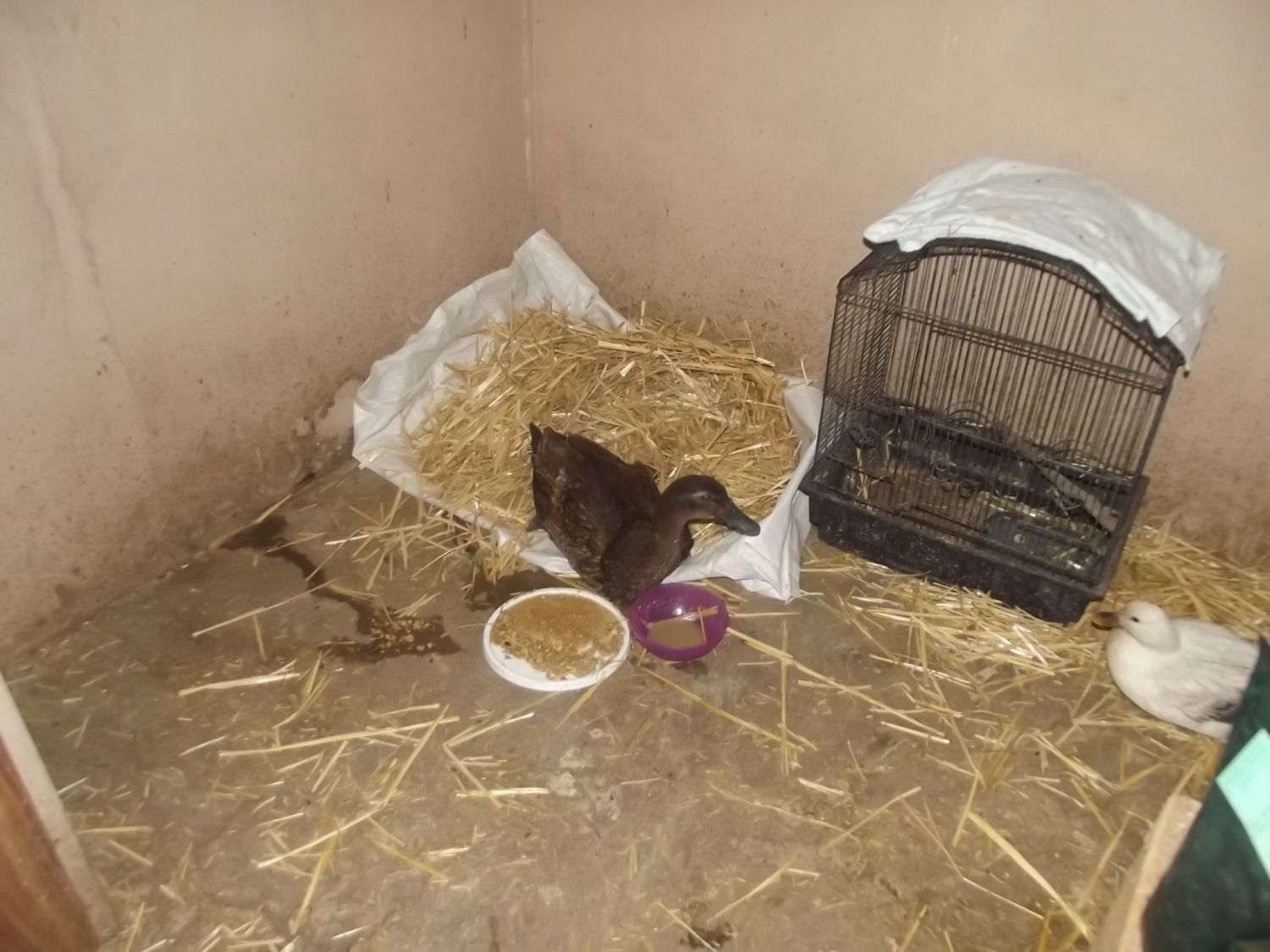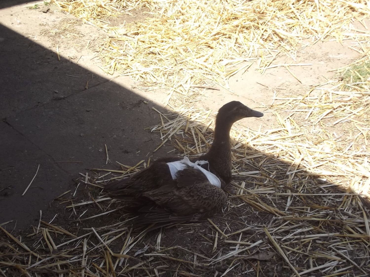 She really, really cant move now. Before she was kind of 'clawing' about, now she cant even do that but it might be a good thing. This is her sister Ephinny, who was uninjured but had severe shock the next morning. One sister dead and one disappeared! She wandered around honking doing her best goose impersonation until I put her in for visiting hours.
