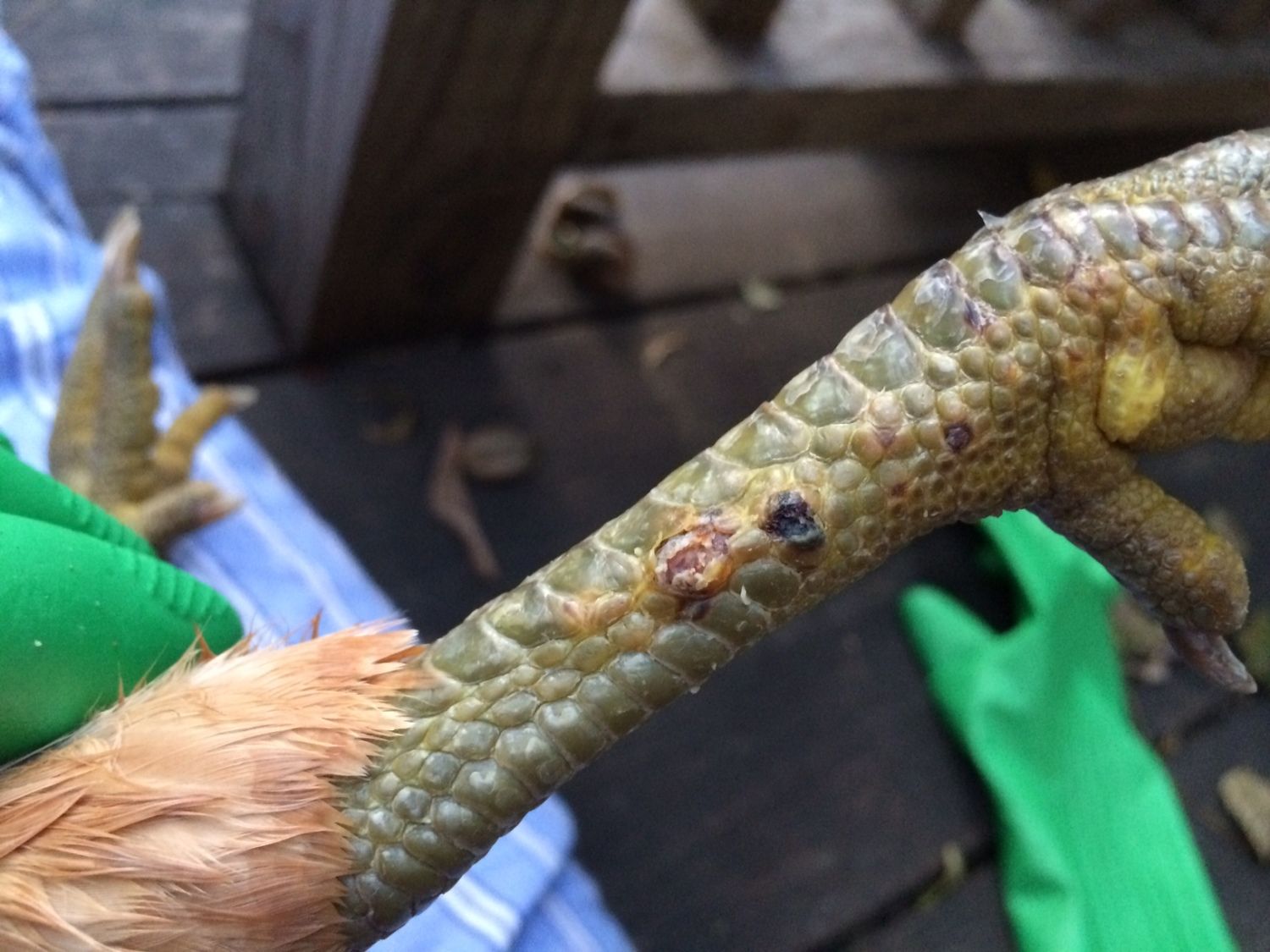 Hi y'all! My Ameraucana, Eleanor, needs your help. I notice some sores on one of her legs the other day, and wishful thinking, I waited to see if it'd resolve itself... but it hasn't. I took a closer look and saw that one of the sores appears to puss a little; the other sore is hard and black. After looking up possible causes like mites, I gave her a warm foot bath, tried to open the wound (not much luck there), and then I put some olive oil on her legs/feet as I heard that would suffocate mites.
