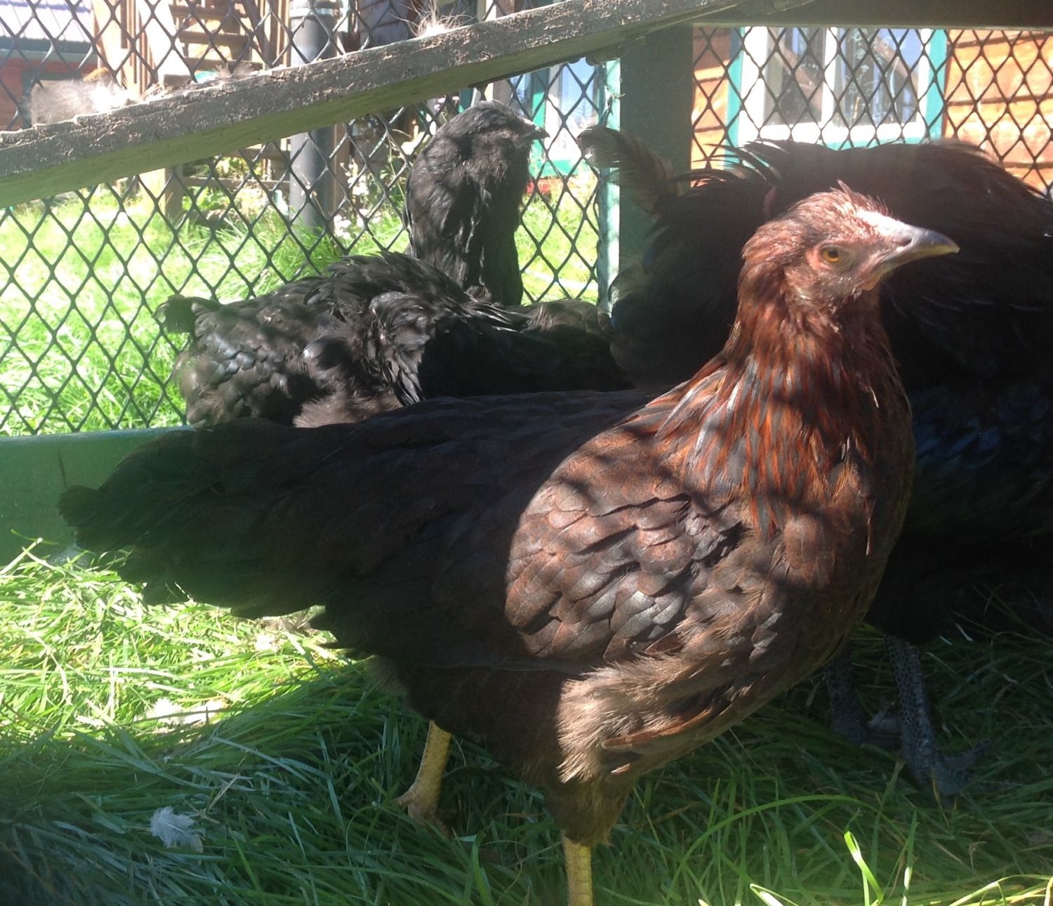 The black back front left is a Black Ameraucana, the hen with her head and neck stretched nice and tall looking right is a single comb dark brown. Her white ears are clear, but not super large. She is about 1.5 years old.