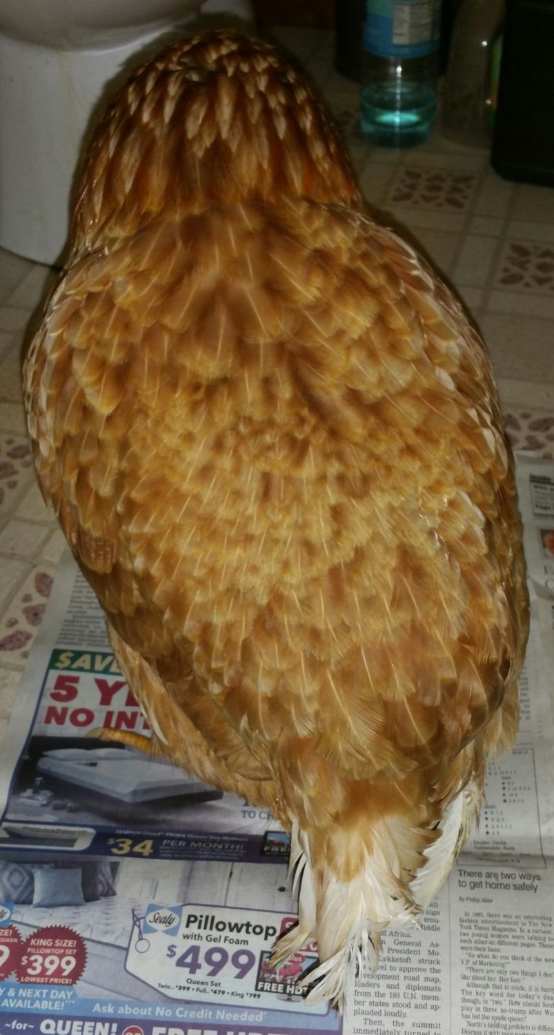 I offered her some electro/vit/probiotic water and she drank a good bit. So, I figured I would offer her some food and she was quite hungry. She ate several tablespoons of purina layer pellets, with a little corn mixed in (what the others are eating right now). I also gave her some dried meal worms and she scarfed those down as well. She would eat for a minute or two, take a few minute break, eat again, repeat. She refuses to bend over to get to anything. I made a makeshift shelf from a box that was a little below beak height and she was happy with that. After eating, she pooped and is sleeping again, in my bathroom.