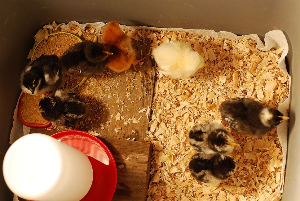 10 ) The chicks are in a plastic tote with pine shavings and a heat lamp.