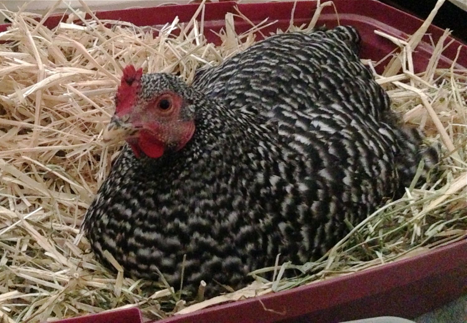 She came from a reputable breeder and she is the youngest and best bred of my birds. I only have five and to keep peace in the coop I have one 6' roost that they share. She has a buddy who I hatched in my classroom, they sit on one end and the other three sit on the other most of the time (sometimes they are all together). The nice thing about a small flock is that there is minimal picking. When I was away they all were kept in the coop and run, they were not let out so there is no chance that she could have been injured by door or other. Now she does have a reputation for flying into the wire mesh at random times. That is the only thing I can think of that would have happened. We have a fox that has been lurking around, maybe he startled them. I love her but she does some silly things that amaze me! I really hope she is just stressed. Thank you all for you advice. I will keep you posted, as for now she is happily sleeping in the guestroom.