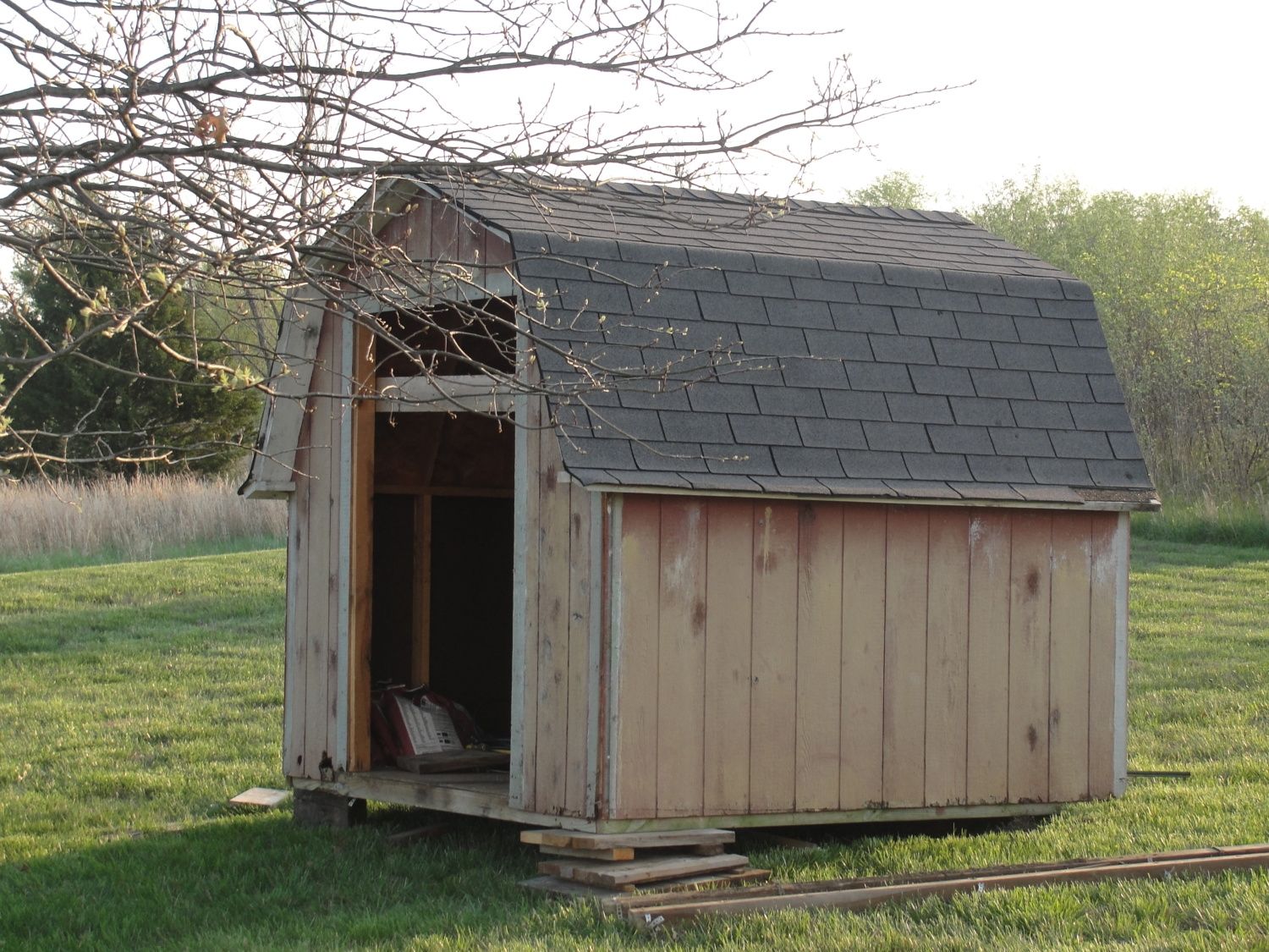 The base is treated lumber, the cap has plastic attached to firring strips, then the tarp, also secured with firring strips. I used some old tongue in groove to frame the outside access doors and some old tomato stakes for bracing. It's pretty heavy, so must be moved with a vehicle to new locations. The nest boxes are lined with thick cardboard for insulation and their front comes completely off for cleaning. Roosts, waterers and feeders will be added later when the layers are installed.