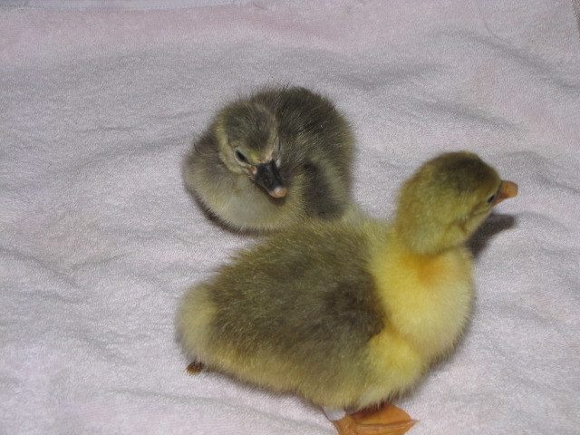 We have 2 new goslings which hatched out Sunday and Monday. So here are my Hanna and Nikki goslings the looks to be Blue saddleback. Now there is a grey gosling and I am not sure if I can get grey gosling from grey saddleback female and a solid lavender gander? If you can then this grey is their gosling as well. If not I know it would be Ginger and Sammie goslings, Ginger grey saddleback and Sammie white.