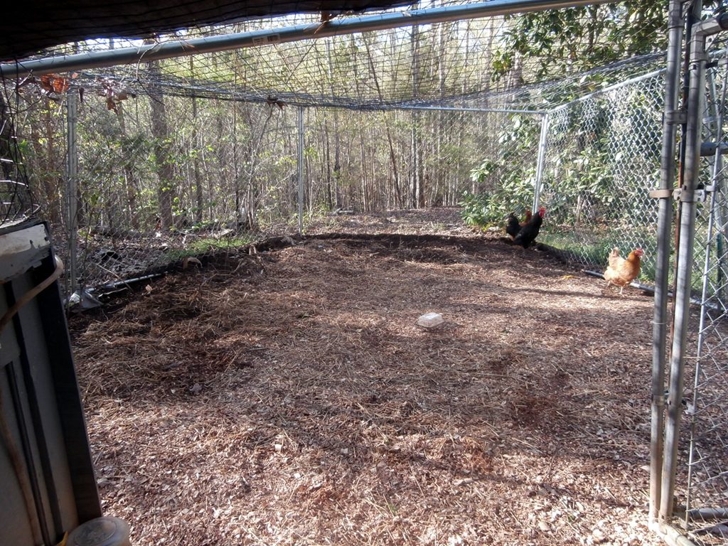 The run. The entire 200 Ft2 (est.) enclosure is roofed with 2"x4" welded wire, which keeps the chickens in and potential winged predators out.