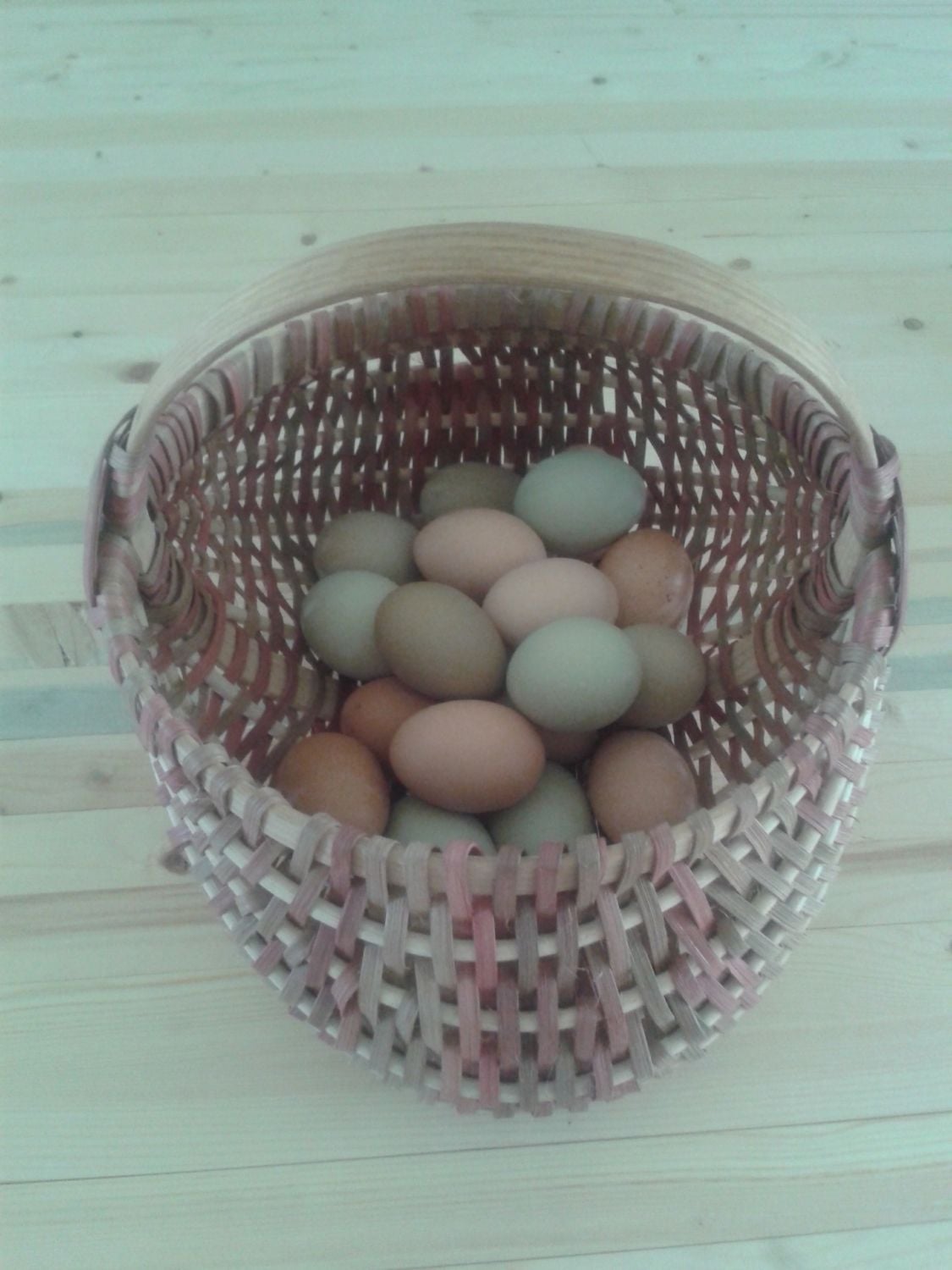 This is my egg basket. Cheap at the dollar store. I never wash my eggs. I do refrigerate the ones older than a week. I explain to my egg customers that washed eggs are illegal in Europe because washing the bloom off causes them to get salmonella and lots of other microbial diseases. Only the US allows washed eggs, and Europe made US eggs illegal to sell in Europe. Mineral oil does not protect them from microbes, only the egg bloom will.