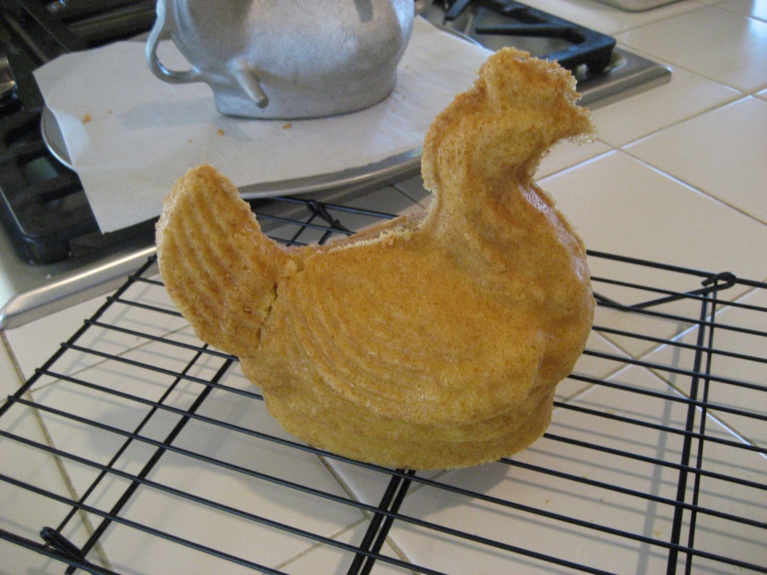 Hen pound cake turned out quite well, except she got her tail feathers in a dizzy coming out of the pan and it fell off :barnie - added tooth picks for the pic :D Should have removed only 1/2 of the mold and let the other half sit some more time before totally removing the mold. Will definitely wait till totally cool to clean up the edges.