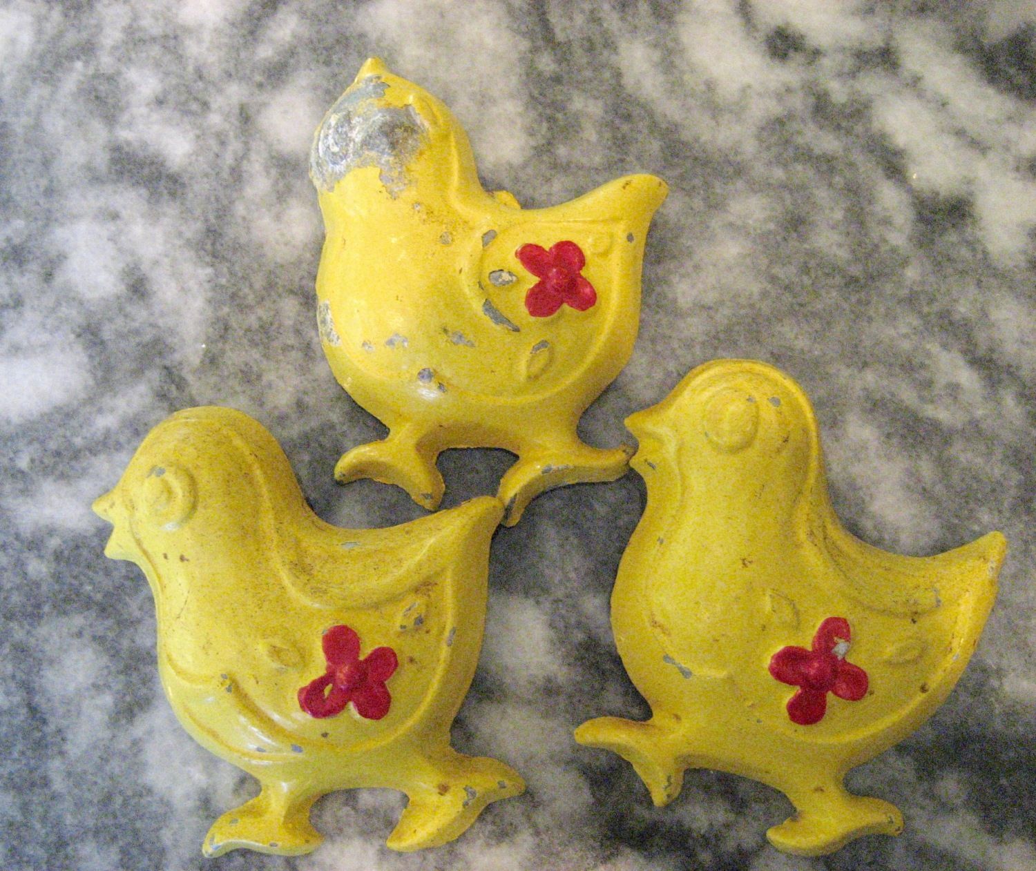 These little ones are gonna take some work. About 3" tall cast aluminum wall hangings, by Sexton USA 1971. DH will sandblast them so I could use them plain aluminum or repaint with a better technique.