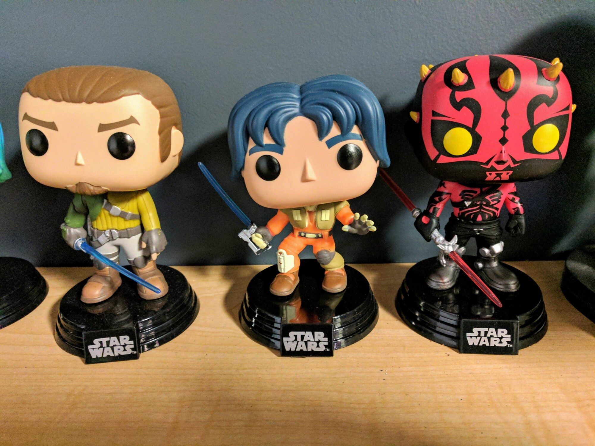 AwesomeOoh! I wanna jump in. These are on a shelf in my office at work (you can see Sabine's hair there on left) I've got all the Rebels Pop! figures, and a whole lot more from a bunch of geeky things.First movie I ever remember seeing was Episode IV, and I've grown up a fan. My oldest grew up with the Prequels, my next oldest with TCW, and my 2 youngest now have the new material Disney's pumping out, so ti's kind of fun to see the universe from their perspective based on that "their" Star Wars was growing up. So far I've loved Rebels, and even though S4 will be the last one, I know Filoni will try and give us an awesome last run with the crew of the Ghost. Ahsoka Lives!