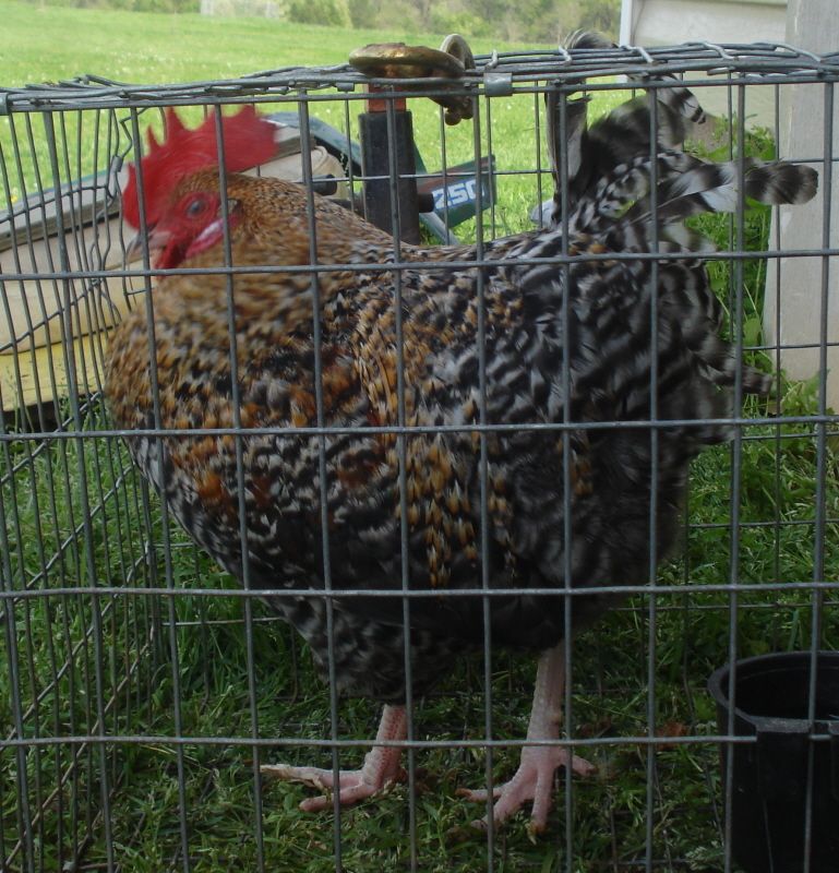 I am happy to say my new bantam marans arrived today! On of those being a gold cuckoo cockerel. He is bigger than his blue/splash counterparts that arrived with him today but I do have plans for him. I will use him over my existing black & cuckoo bantam pullets, they lay a decent dark egg for bantams, his earlobes are starting to express some white hinting he is losing egg color capabilites so their dark eggs should hopefully make up for that aspect? I will cull heavy for size from their offspring for my next generation.