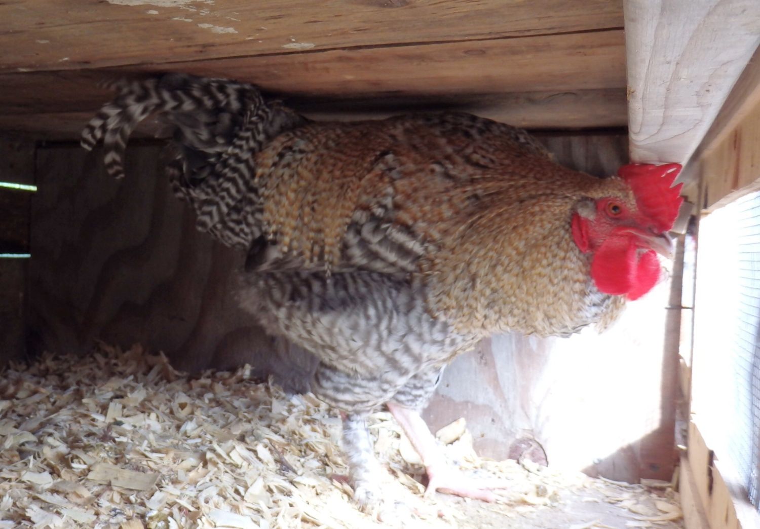 I love the rich copper coloring, but I'm thinking I will keep the cockerel below, which is a compromise between the two colors. I like his barring, which extends to his tail more than it does in the other cockerels. He lives in a cage, because the others bit off the blade on his comb: