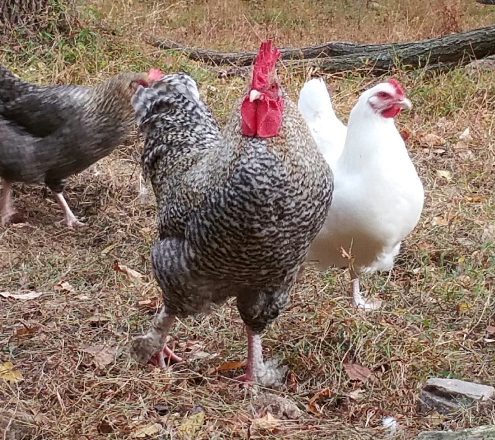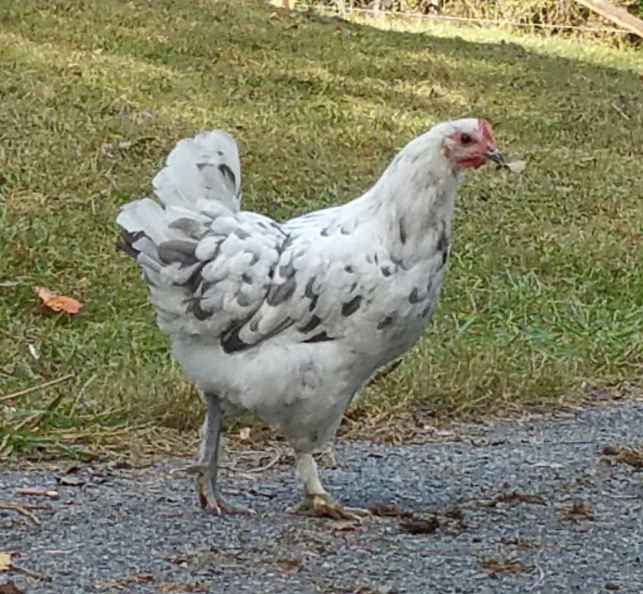 make sense  your white pullet is pure white ,she come from a cuckoo chooks . the barring gene help the produce a pure white . nice white feet too .