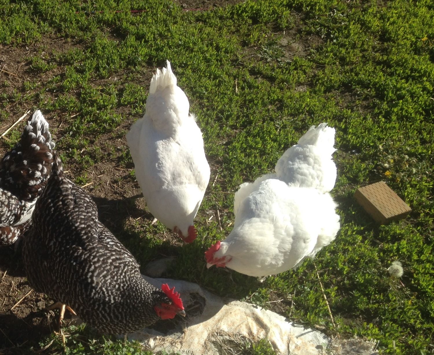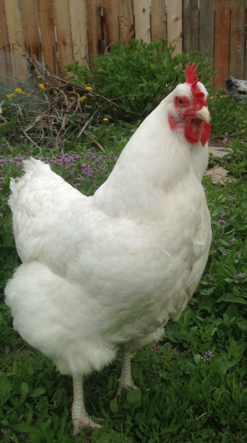 I think I have a white Orpington pullet... I hope she is a she. She was supposed to be a buff, but now fully feathered and still light as can be... she likes to peck at my wedding ring. Another few days and I won't be able to snatch her up with one hand anymore!