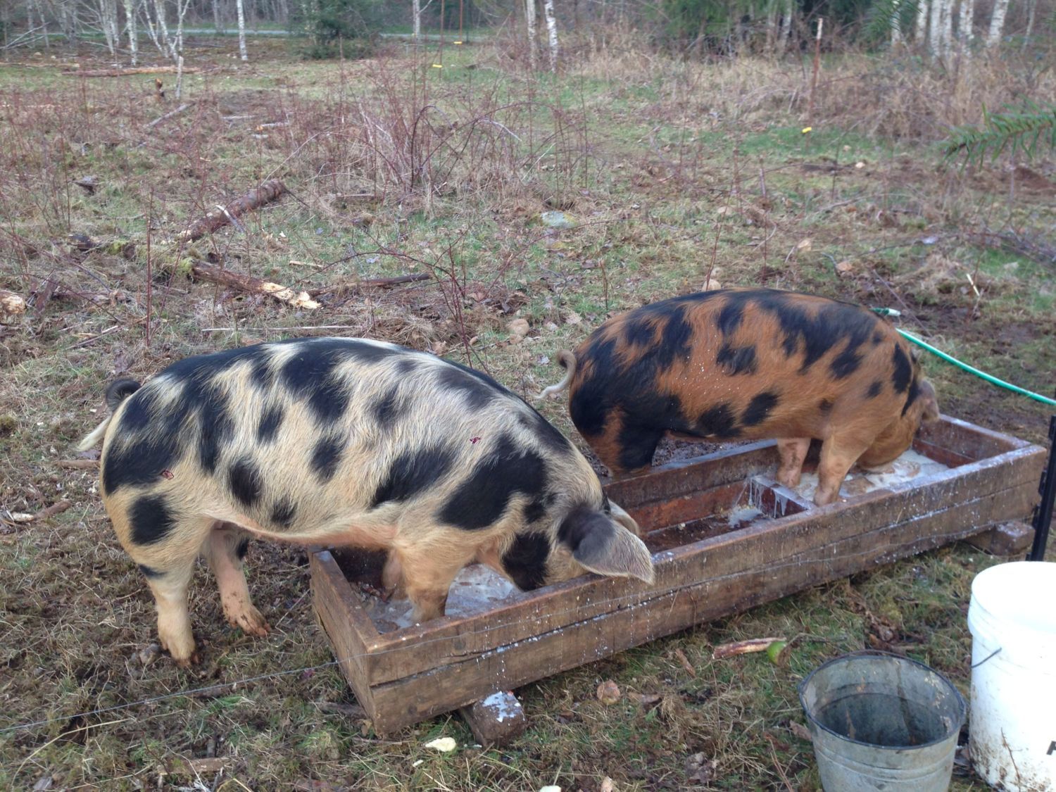 I'd figured I'd share my pigs as I usually am only on here for chickens and ducks lol. This is my 2nd year raising feeder pigs and gonna be my first year raising breeders. The first pic of the two are my feeders, the white with black spots is a Gloucestershire old spot berkshire cross, and the red spotted one is a hereford berkshire cross, the white spotted one is gonna go here soon so I'm excited to see how she turned out. We pasture raised these two which was something new for me as we had our pigs in a small area the year before. Pasture raising was a lot better because it saved us money, time, and stress. At first I was not wanting to get pigs because I thought they smell really bad, were noisy, but I actually really liked em. Besides the fact that they got out a lot on us last year, they proved me wrong. Now I'm looking forward to breeding pigs this year. The second pigture is of my breeding stock. 2 hereford gilts and a hereford boar. I just got these on Sunday from a national breeder down in oregon. I live in washington so I had quite a ways to drive to get them, but I tell you they were worth it. I actually was getting impatient on buying the Herefords because I was on a waiting list for them from another national breeder near me, I was thinking about buy Berkshires since they seemed really cool and a nice looking breed, but I looked around, called people here and there and finally found the breeders in Oregon. But really pigs are a lot of fun, it's a learning process but just gotta do a lot of researching a learn different ways you can raise em.