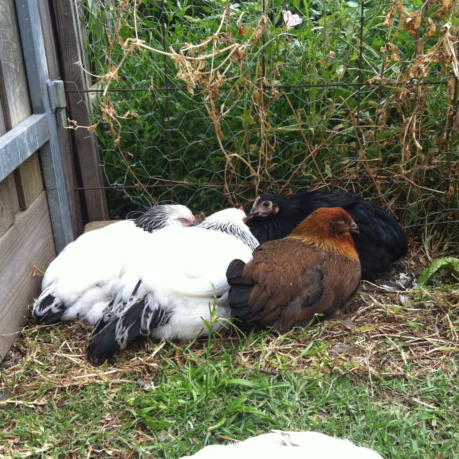And here s/he is chillin' with the girls, while the roos were hanging out next to my chair (long tail in the middle):