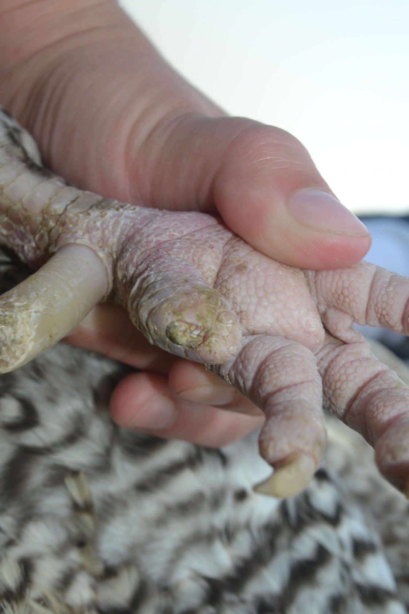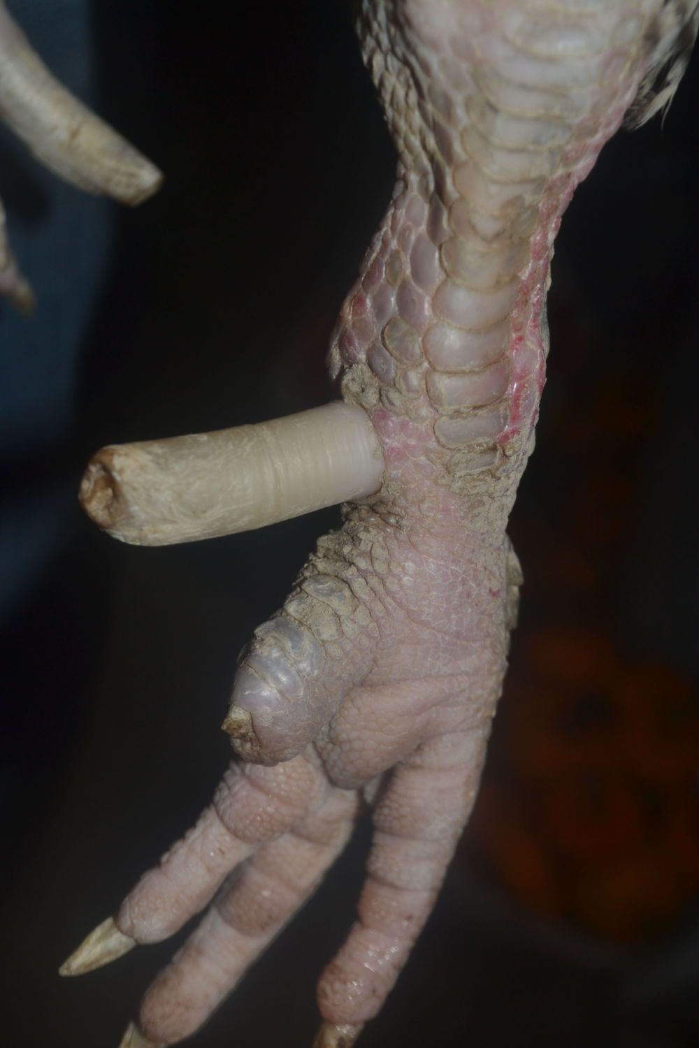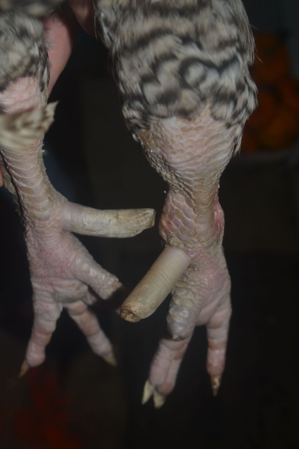 The pics arent the best but it was what I could get with him squirming. The 1st one is the bottom of the injured foot. No sign of bumblefoot. He has no reaction when I push on it either. You can really see the size difference of his feet in the 4th pic
