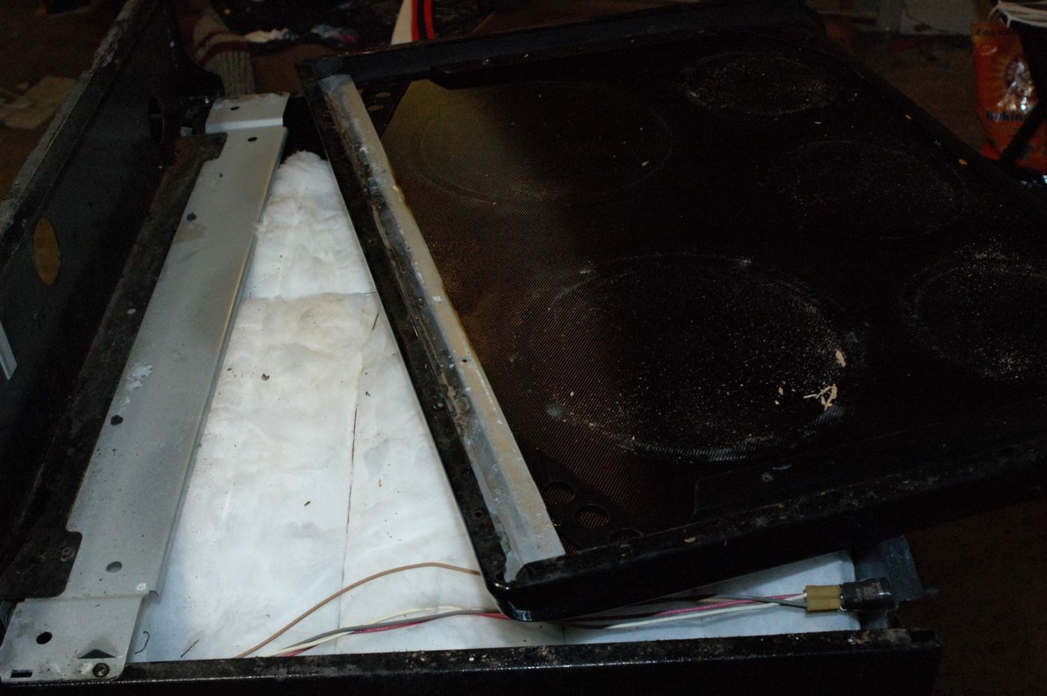 I removed all of the heating elements under the stove top to reduce the weight. I also removed all of the wires from the back. I figured I could used the wires for some of the incubator components.