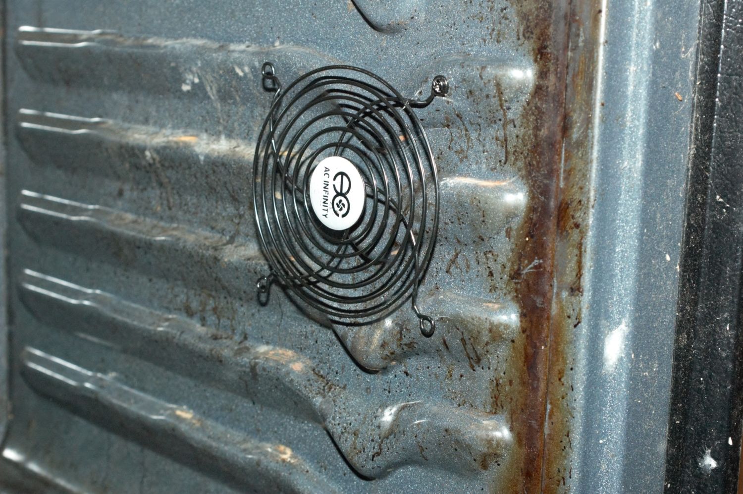 Then the entire fan assembly was mounted. At first I wasn't sure if I should have added spacers, but the ridges for the racks ended up providing just enough for circulation. I fed the power cord through one of the upper element holes...after cutting off the plug.