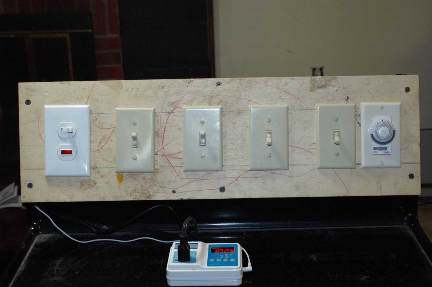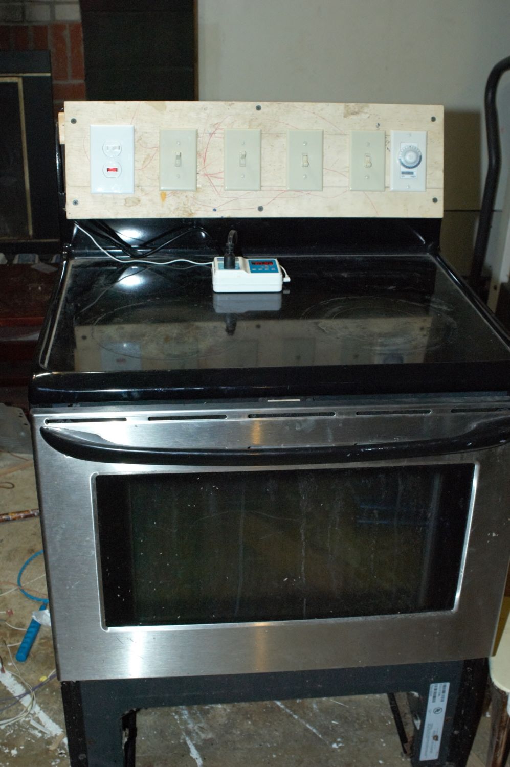 Then I had to make a control panel...Okay, I could have just made everything plug in, but I had to make it fancy. So, I made a wooden box for all the switches and fed all the power lines into it. Then I mounted it to the top of the stove where the original control panel was.