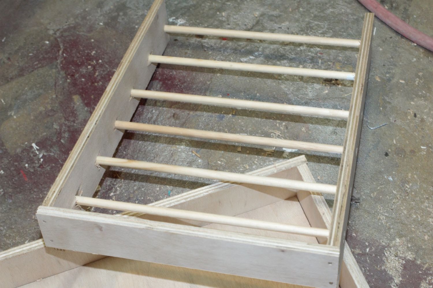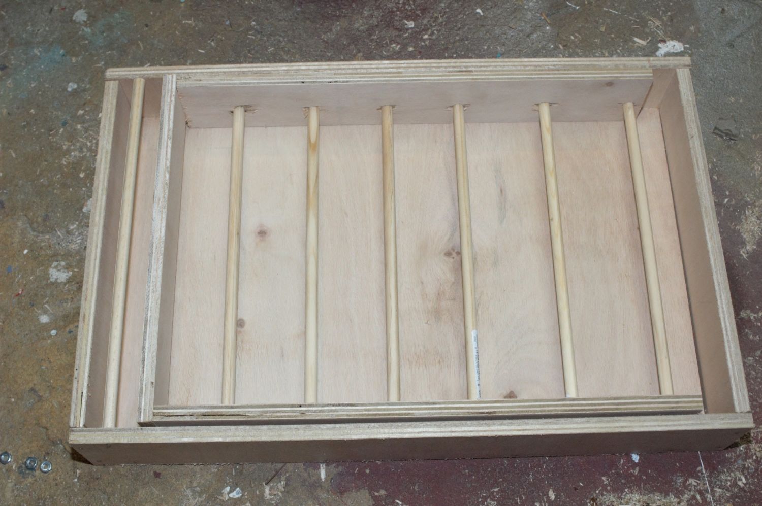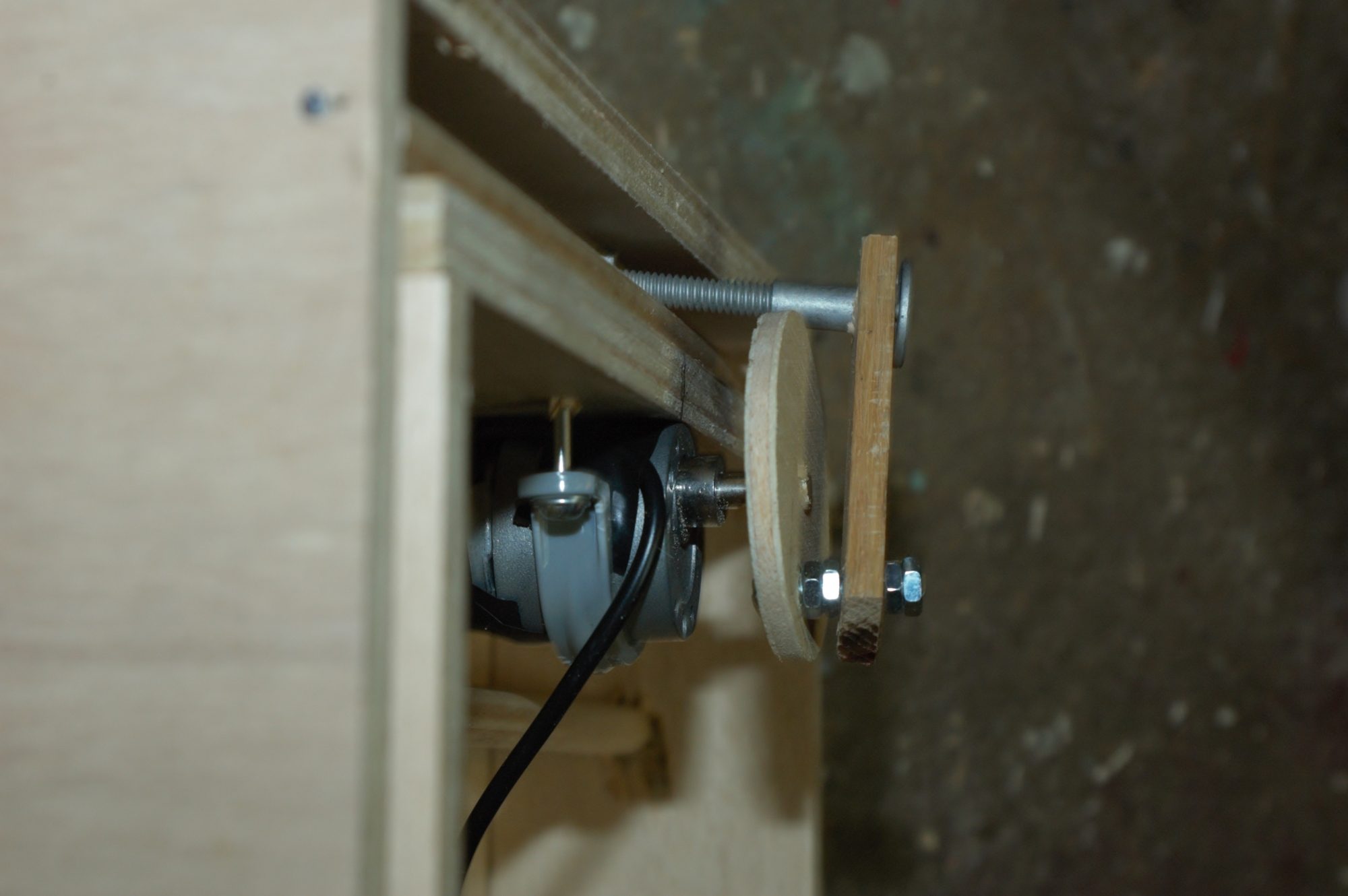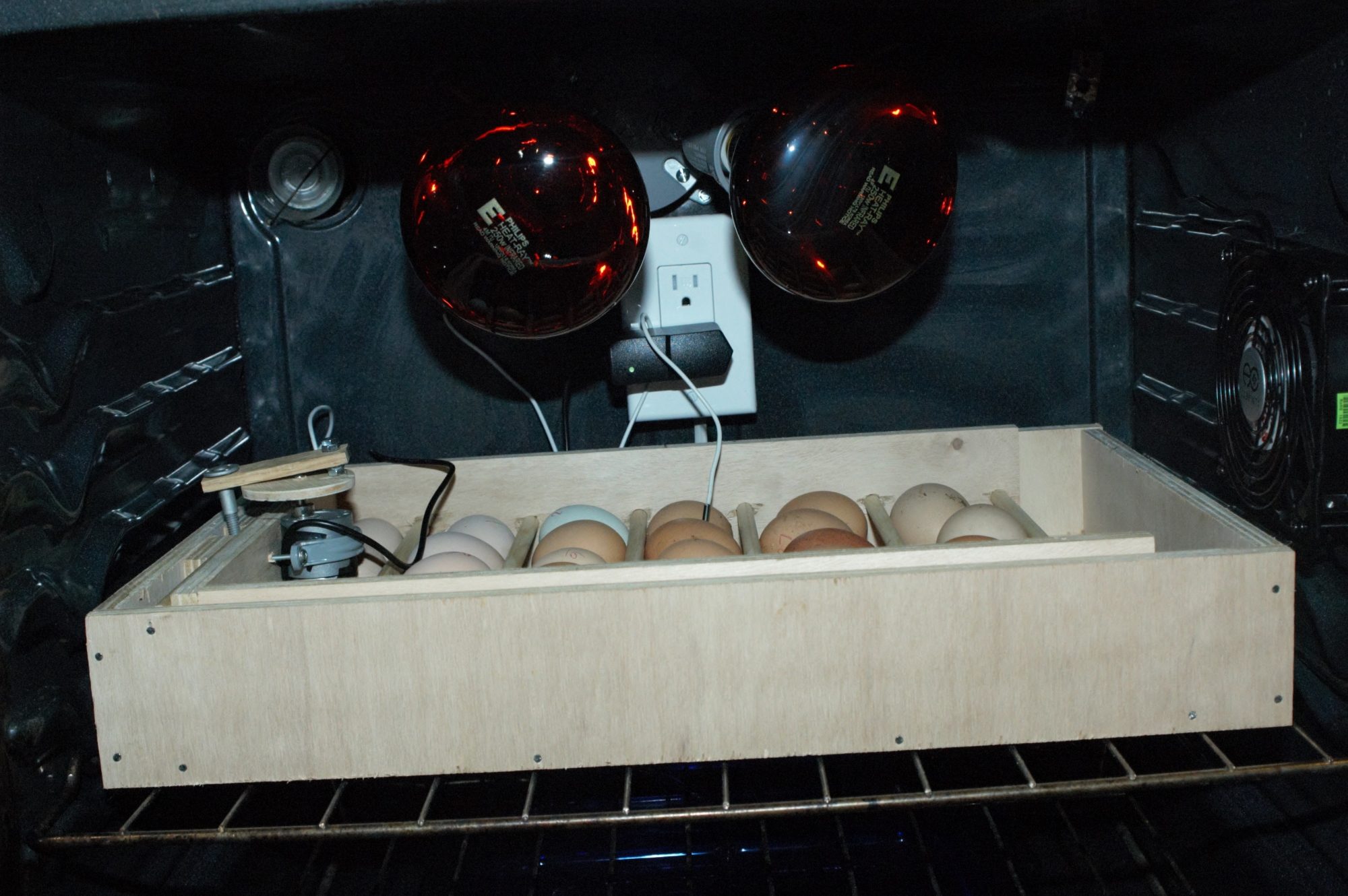 I made an egg turning box from plywood and rods. Made two different size racks for extra large eggs. It holds between 24-36 eggs. Then it was time to make the 'turning' mechanism. I was originally thinking of mounting the motor outside the oven, but then thought it would be best to have it inside so I didn't have to try and make a complicated gear mechanism.