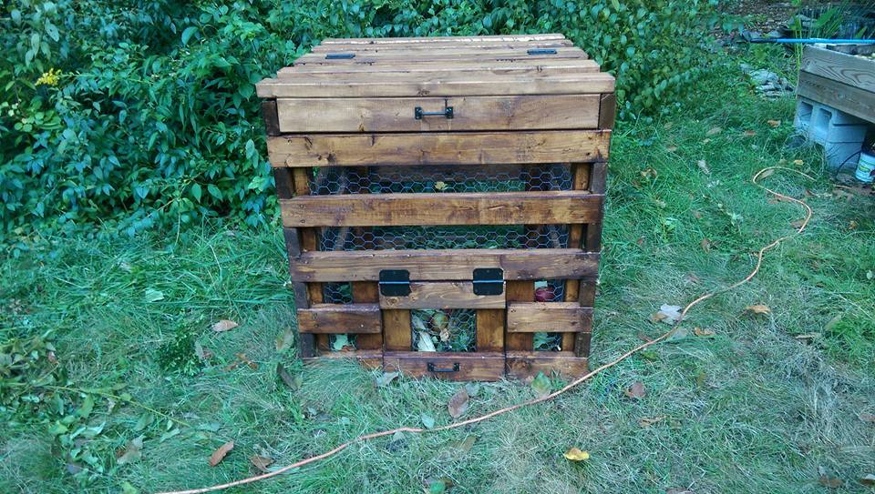 Compost bin. The top swings open for easy access when adding materials, and can be removed completely for turning.