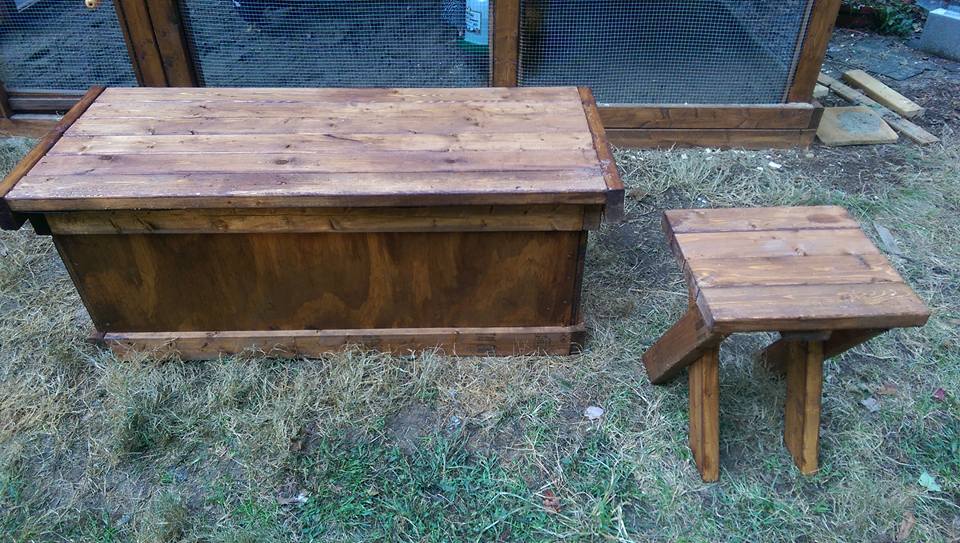 Storage bench and drink table. Feed, PDZ, and scratch, as well as a bottle of hand sanitizer and a collapsible coop rake fit inside, and when closed, we can sit on it to watch the chickens and put a drink on the table next to us.