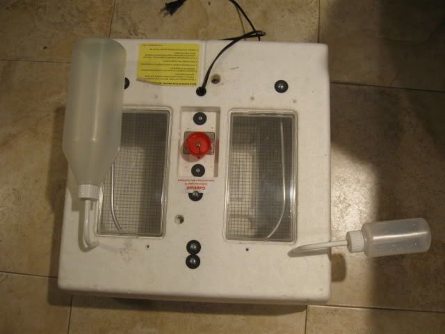 This time around, I took a bit of thin surgical tubing and a syringe and put the tubing through the hole for the fan wire and laid the free end in the well in case I need to add water. I'll do the same to the hatcher so I can easily increase humidity. I had trouble with that last time and had a very difficult time keeping RH up the last 3 days.