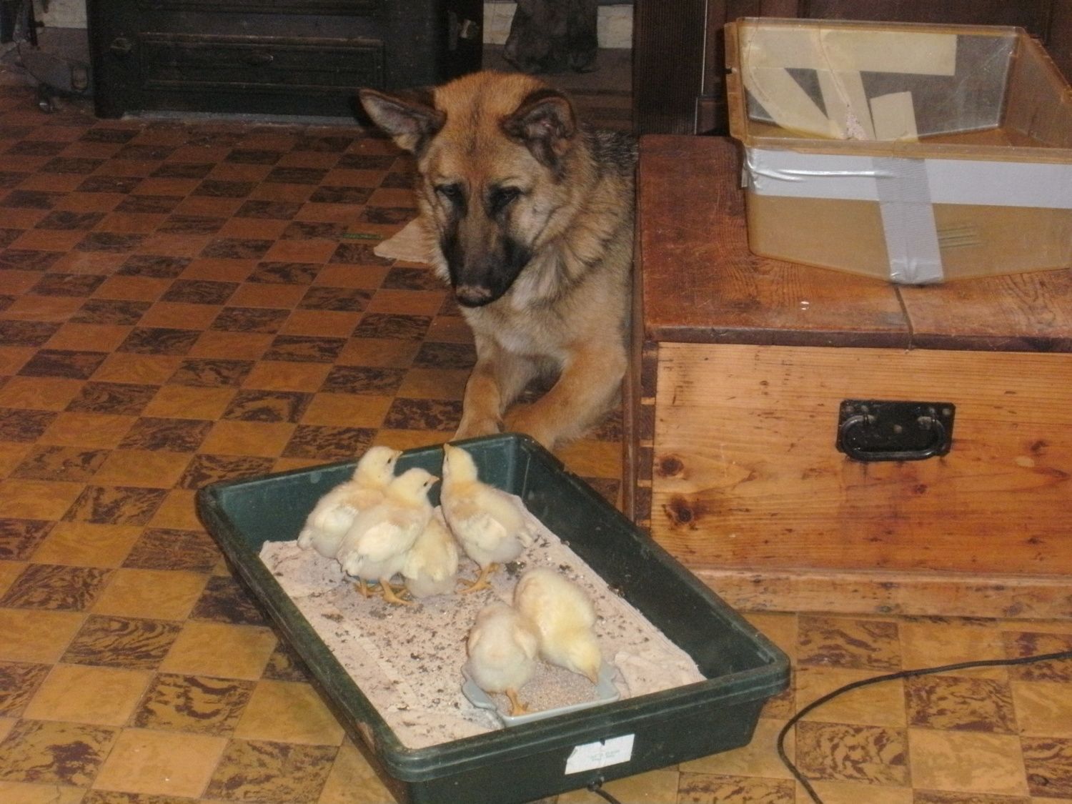 Chicks finally had to get moved outside when I found them perched at the top of their box! Here's a photo of them in their new digs. They are about a month old now.
