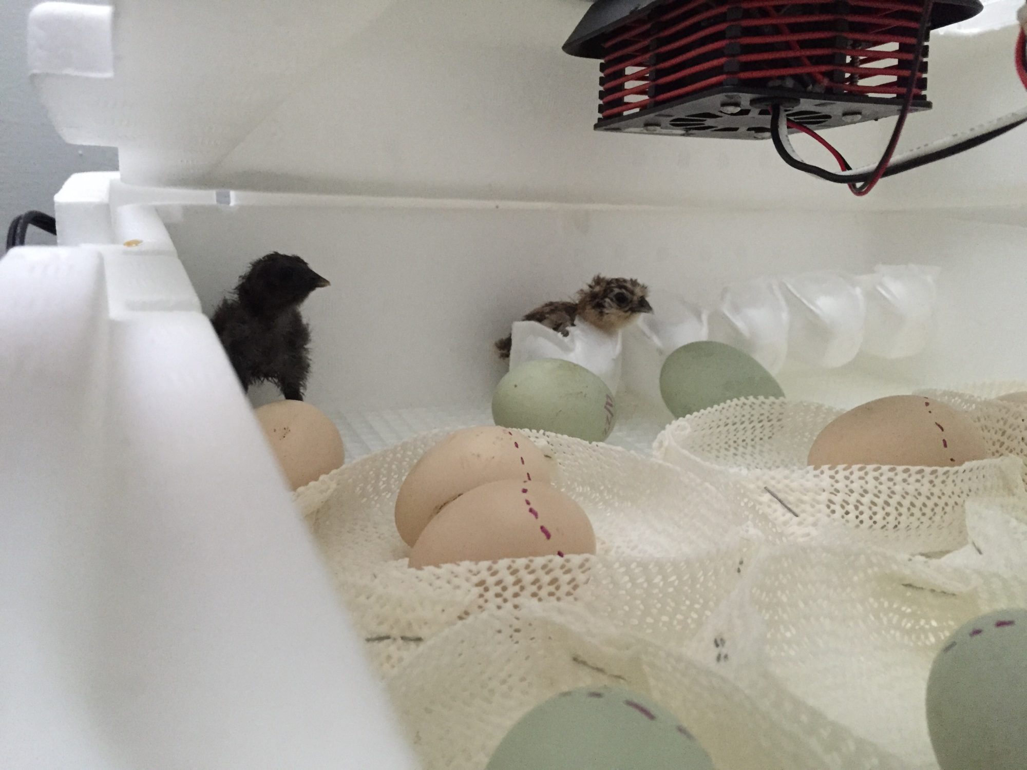 So we've got two! When will these little guys be dry and fluffy? And when should I start seeing more pips? We're on day 20. (Also, the incubator was open for about a second to take this picture and it's very hot and humid here in Kansas lol)