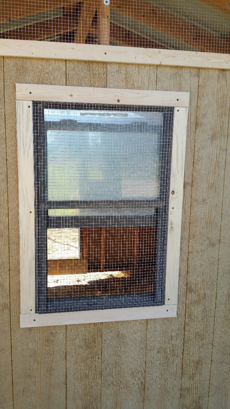 This is the side that the roost poles are on, so we left in the real window, but covered it with hardware cloth so that it can be opened during the summer or closed off during the winter.