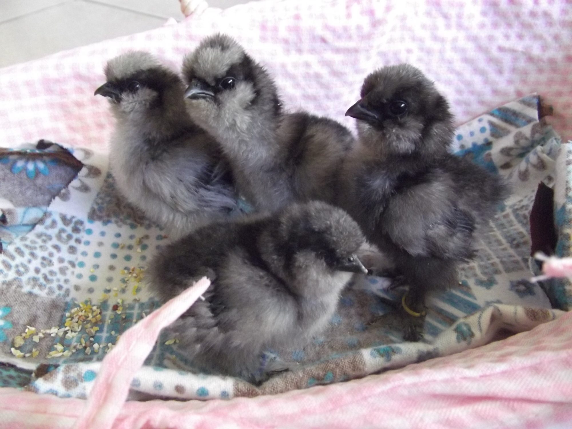 The little one (in front) has been named "BB" because she/he is small, round and grey. It was the last one (and tiniest egg) to hatch. I would have named it "Silver Bullet" but "BB" just seems fitting!
