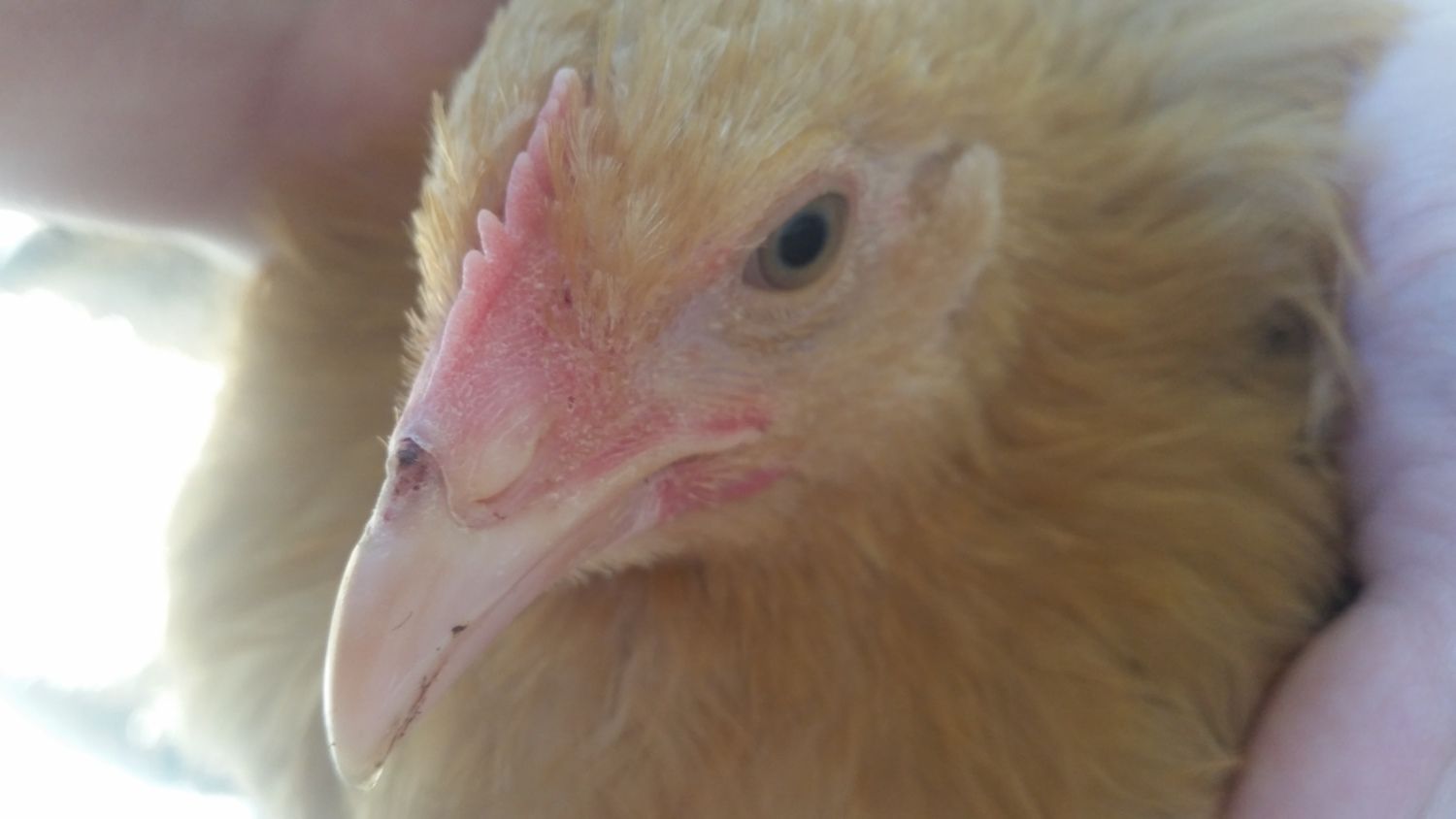 Hi guys, recently noticed these bloody looking spots on the top center of the beak on two of our three chickens. I have no idea what this is.
