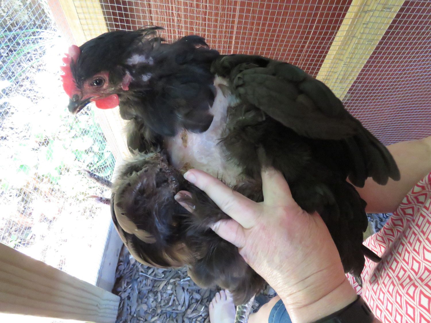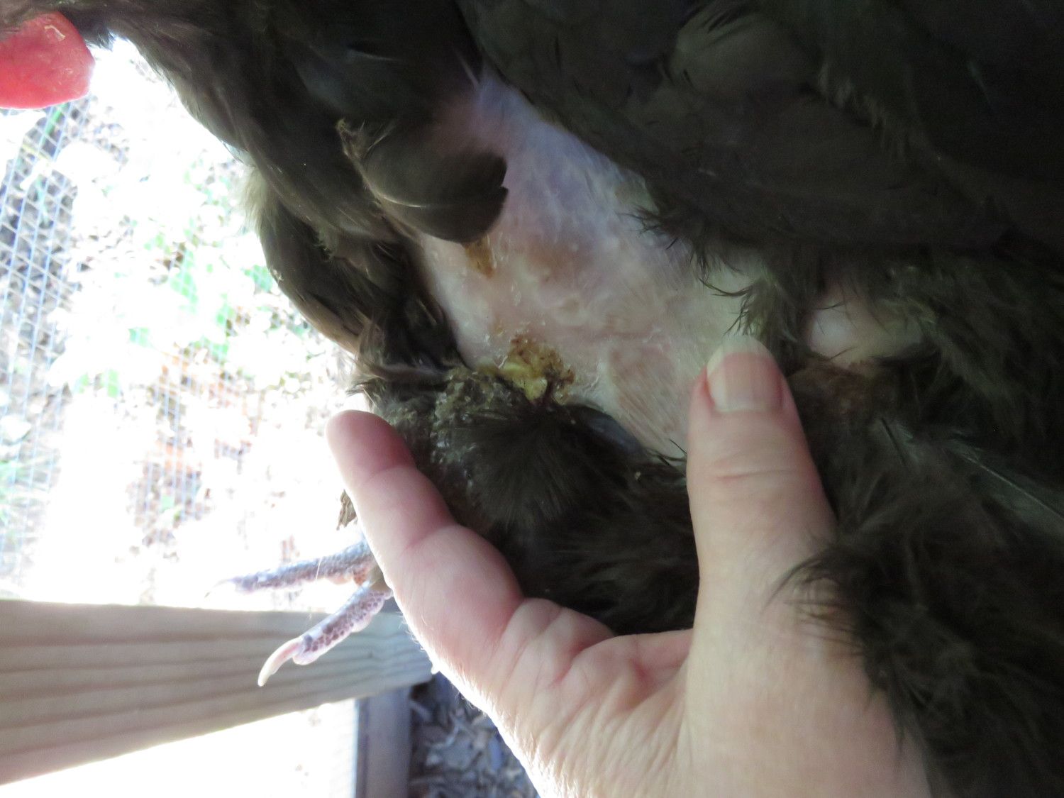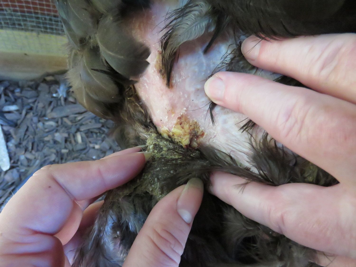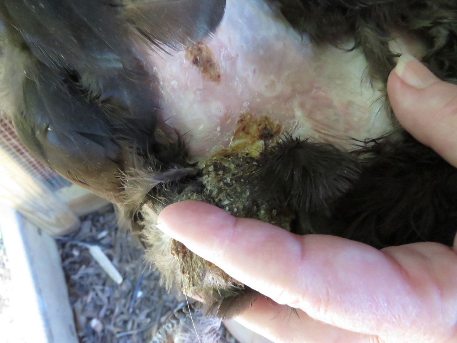 Now the bird’s feathers are coming off and they are crusty and stuck together in a hard clump that isn't attached to the skin but is attached to the surrounding feathers and therefore 'flips' away from the bird (see picture) the Rhode Island Red died all of a sudden a couple of days ago – she checked on them in the morning and the bird was dead in the afternoon; we did call the local authorities to report the sudden poultry death they weren’t interested as all threat of avian flu is gone now and the other birds are still alive, the vet didn’t have any suggestions. The Australorp has ‘black spots’ that are sometimes on her skin and sometimes not (because I couldn’t find any evidence of them when I looked and my mother-in-law is slightly color blind so they could have been purple spots). I can’t get good descriptions from my mother-in-law so I took as good of pictures as I could with a slightly-struggling chicken. Other than the feather loss and crusty bits the bird is acting normal, the other two birds are acting normal too. The Rhode Island Red was acting normal before she died. What is this? Could it be mites or lice? Is it something worse? How do we treat it?