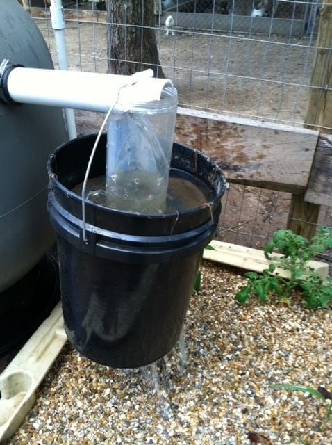 The gravel bed is a piece of floating dock that my pal salvaged, and the swirl filter is an old swimming pool filter that I salvaged from a pool shop dumpster. He built a bell siphon in the bed that fills/drains every 15 minutes. When the swirl filter gets loaded up with solids, one can just oped the valve at the bottom and clear it.