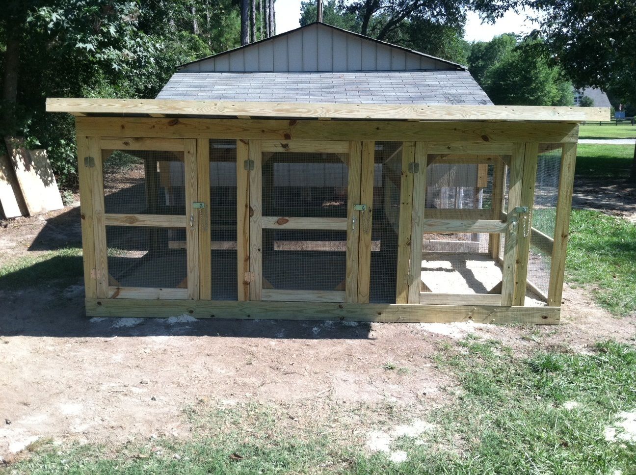 [SIZE=10pt][COLOR=000000]Well I spent the day putting the finishing touches on my Rooster Condo / Breeding Pens for my NH boys today and got them all moved into their new home. This will basically be where they will stay all the time. The girls and the Juveniles will stay in the large coop in the back ground. I plan on building a few more of these for my BR’s, RIR’s and BO’s so this is the test model. I’ll see how it works out and if I need to make any changes before I start on the next one. These will all be open air coops and I made each pen large enough for a trio.[/COLOR][/SIZE]