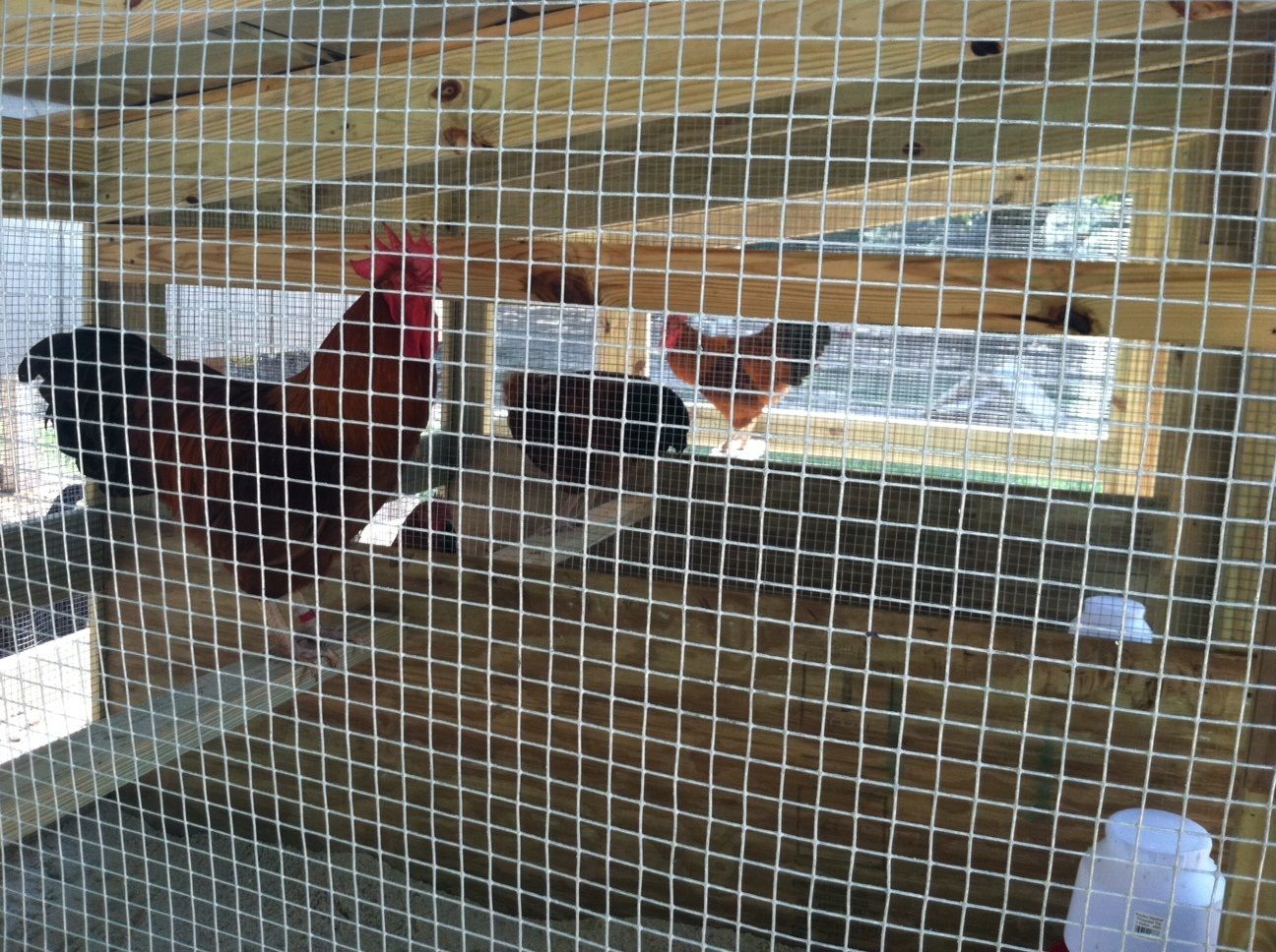 Well I spent the day putting the finishing touches on my Rooster Condo / Breeding Pens for my NH boys today and got them all moved into their new home. This will basically be where they will stay all the time. The girls and the Juveniles will stay in the large coop in the back ground. I plan on building a few more of these for my BR’s, RIR’s and BO’s so this is the test model. I’ll see how it works out and if I need to make any changes before I start on the next one. These will all be open air coops and I made each pen large enough for a trio.