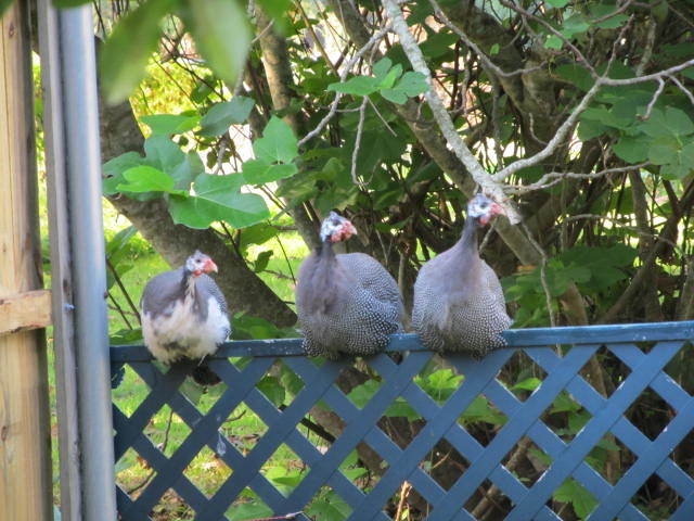 The three Caballeros: they can't stand to be inside the chicken yard - too boring! every morning they fly out & across the yard to hang out in the back by the kitchen door, so they can keep an eye on what's happening.