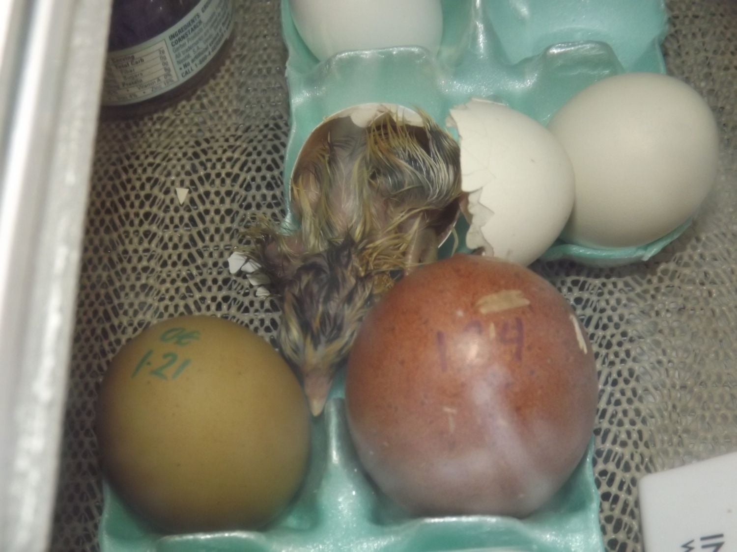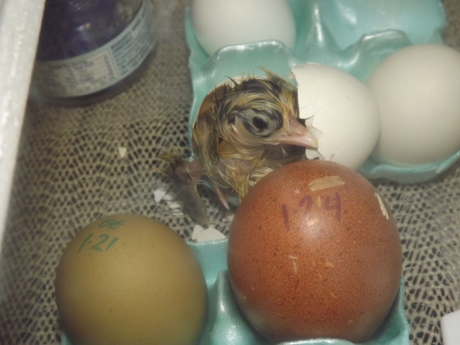 I have one baby hatched tonight. A little Sicilian Buttercup--those eggs are like quail sized. I was amazed a chick made it out alive.