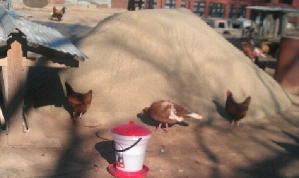 We take one pallet and tear the boards off another to make a bottom. We use some pallet wood he has gotten with 4 x 4s as legs then use the plywood sheets or other pallets to make the sides and top. We paint them and then add the runs.
