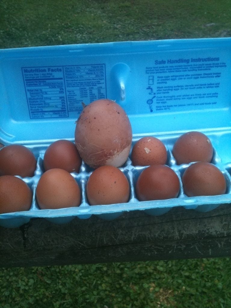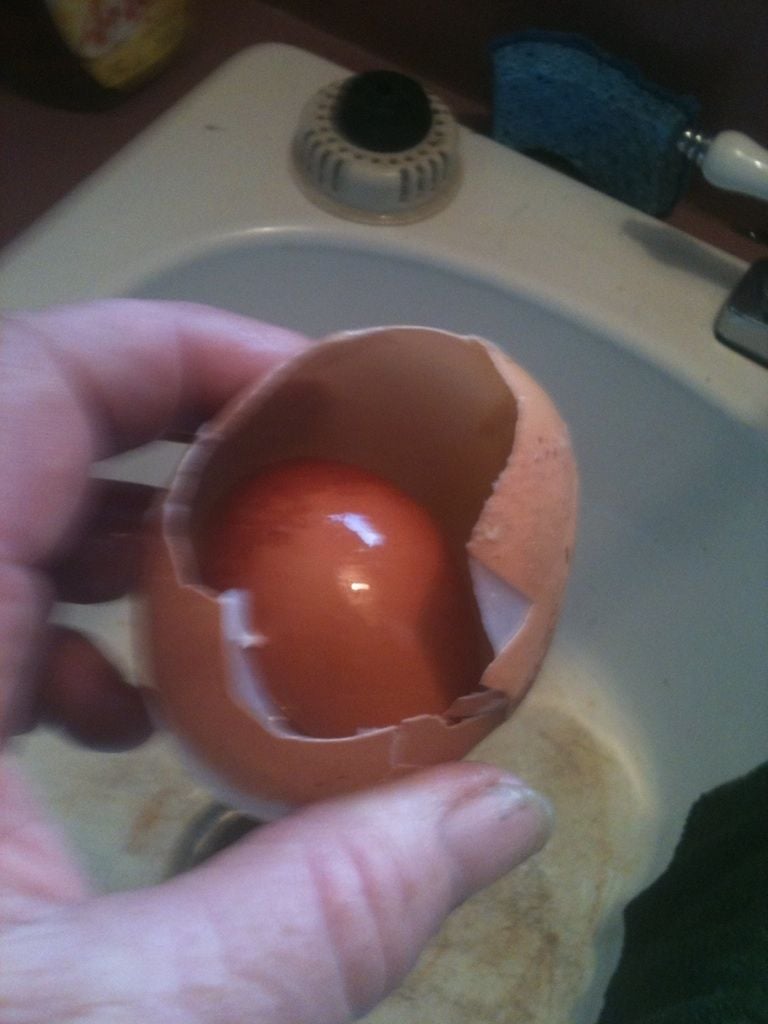 I have no clue how the hen passed it, but the eggs on the bottom are large to extra large so that should give you an idea how big this thing was! He cracked it open expecting a double yolker, and guess what he found? ANOTHER EGG!!!! That's weird and crazy I recently read a story about it happening in China, but never expected to see it happen this close to home! How cool is that? (I'm sure the hen isn't as impressed as I am